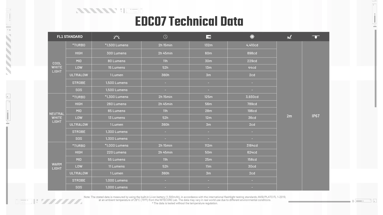 El feneri aşırı ısınmadığı sürece pil zayıfladığında bile kullanılabilen turbo modunda Nitecore EDC07 toplam 2 saat 15 dakika çalışabilir. Çıkış, renk sıcaklığına bağlıdır ve 1.000 ila 1.500 lümen arasında değişir. En düşük modda 1 lümen ile yaklaşık 380 saat dayanabilir. Çalışma zamanları oldukça karmaşıktır, bu yüzden Nitecore'unkileri bu makalenin altına ekledik.
