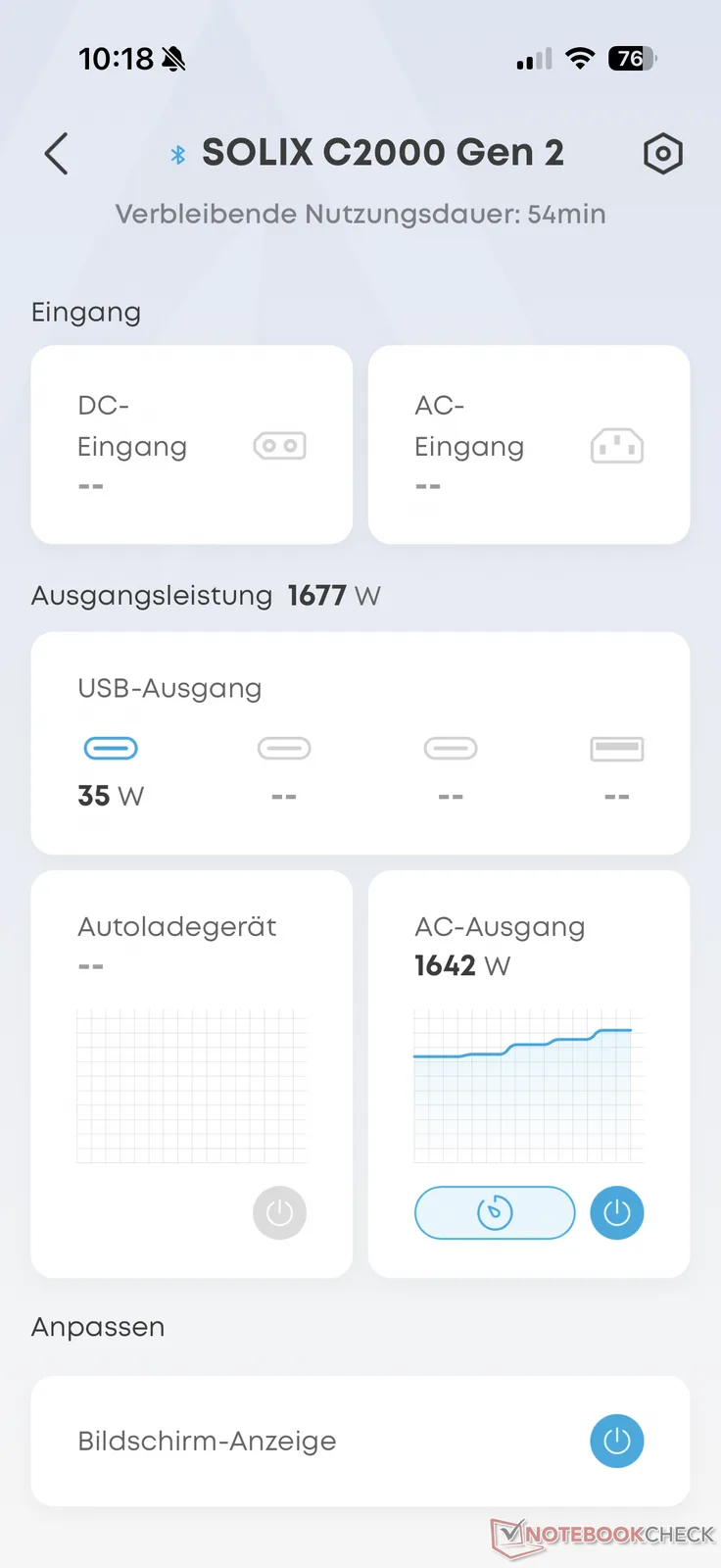 Bununla birlikte, testte AC çalışmasının verimliliği konusunda tam olarak ikna olmadık. Her zamanki gibi, testimizin bir parçası olarak Anker Solix C2000 Gen 2'yi 200 W'lık sürekli bir yük ile boşalttık. Toplam 2,048 Wh kapasitenin 1,600 Wh'lık kısmını çekebildik. Bu da yüzde 79'un biraz altında bir kullanılabilir enerji ile sonuçlanır ki bu da iyi bir değer değildir. Burada, örneğin, daha ucuz Aferiy P280 testte daha verimli olduğunu kanıtladı.