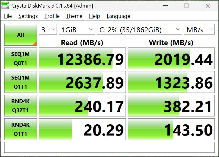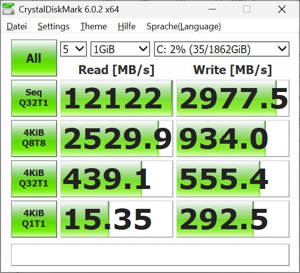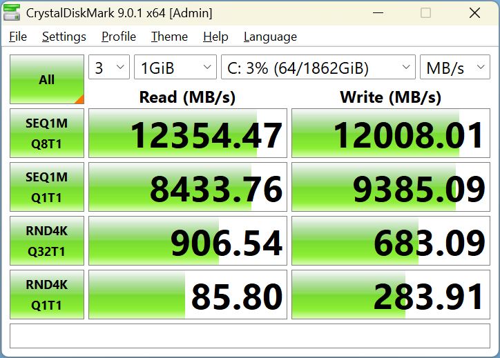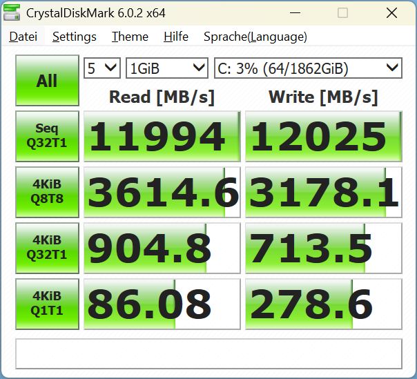 İkinci denemede sonuçlar çok daha iyi görünüyor: CrystalDiskMark 6'ya göre sürücü hem okuma hem de yazma hızlarında neredeyse 12.000 MB/s'ye ulaşıyor - etkileyici bir sonuç. CrystalDiskMark 9 biraz daha yüksek rakamlar gösterirken AS SSD biraz daha kısıtlıdır.