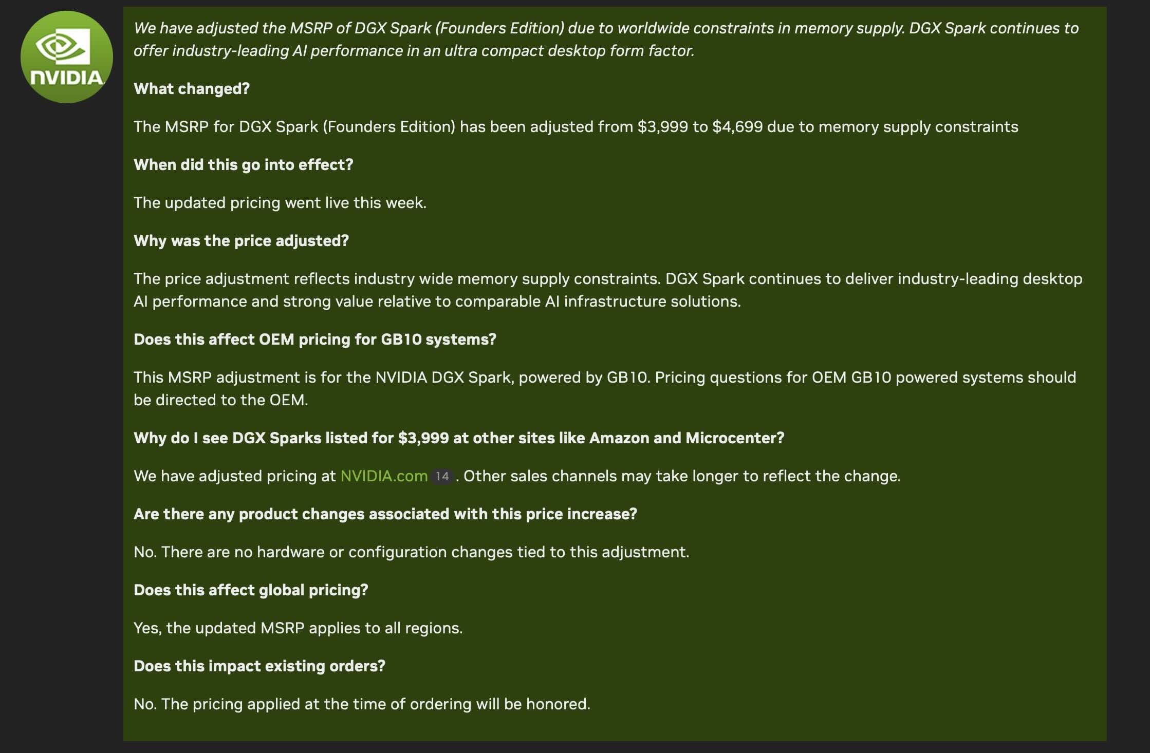 Açıkçası, iş istasyonu mini PC uygun fiyatlı bir sistem olmaktan çok uzak ve 3,999 $ MSRP ile piyasaya sürüldü. Ancak şirket yakın zamanda yaptığı bir açıklamada sistemin fiyatının 700 dolar artacağını ve MSRP'sinin 4.699 dolara çıkacağını açıkladı. Nvidia bu büyük artışı DRAM ve depolama maliyetlerinin hızla yükselmesine bağlıyor ki bu da pek sürpriz sayılmaz.