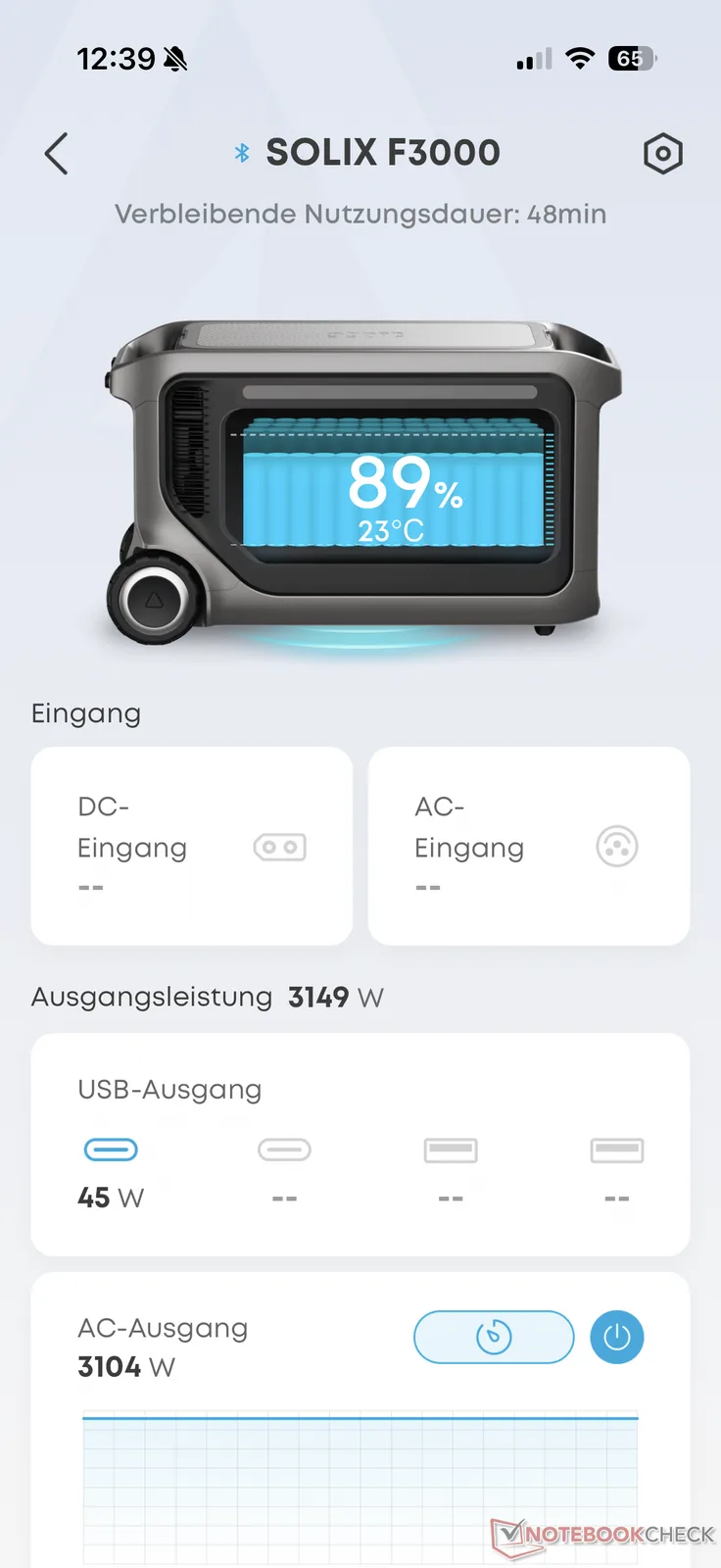 İki sert tutamak, bir teleskopik tutamak ve iki tekerlek şeklindeki taşıma yardımcılarına ek olarak, F3000 ayrıca LCD ekranın karşısına oturan bir LED ışığa sahiptir. Ancak, performans verileri elbette daha da önemli olduğu için bundan sadece geçerken bahsedilmelidir. Anker Solix F3000, testte kağıt üzerinde 3.600 W çıkış gücünü başarıyla gösterdi. Bu, bir evdeki neredeyse tüm cihazlara güç sağlamak (hepsi aynı anda olmasa da) ve örneğin bahçedeki aletleri çalıştırmak için yeterli.
