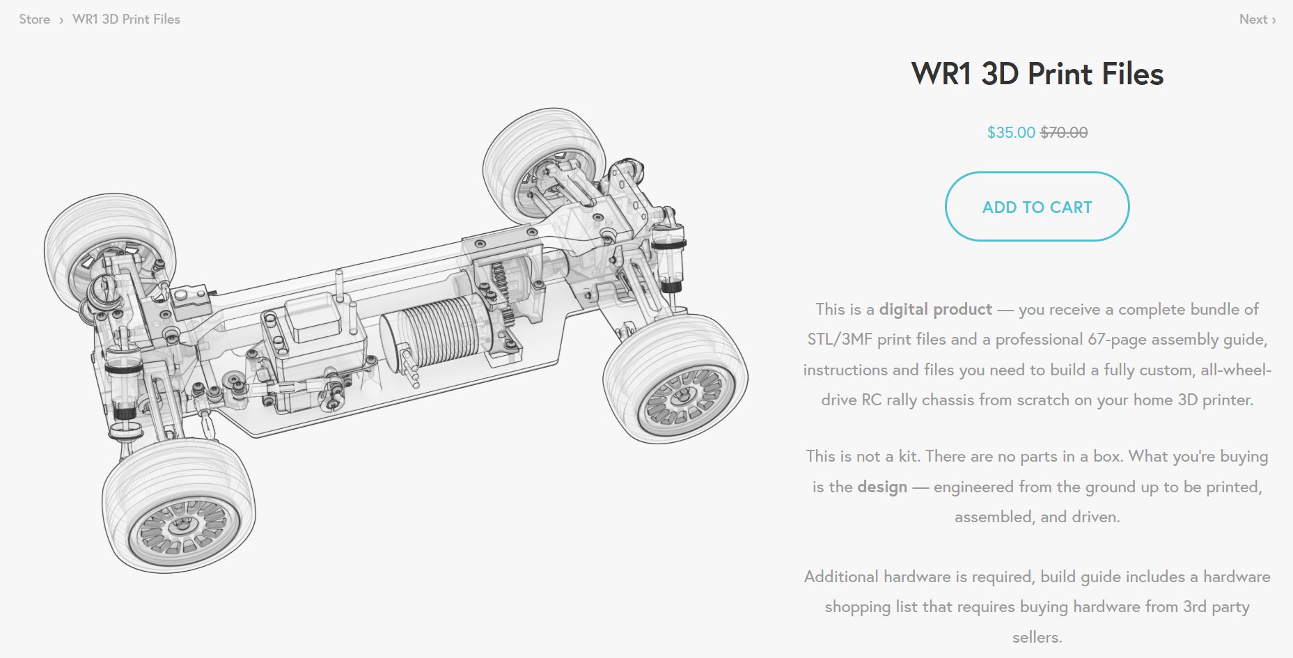 Başlangıçta tüm baskı dosyaları, montaj talimatları ve parça listeleri ücretsiz olarak sunuluyordu. Bu arada ekip en azından yazıcı dosyalarını satmaya başladı. WR1 olarak adlandırılan şasinin 3D dosyalarının fiyatı şu anda 35 dolar.