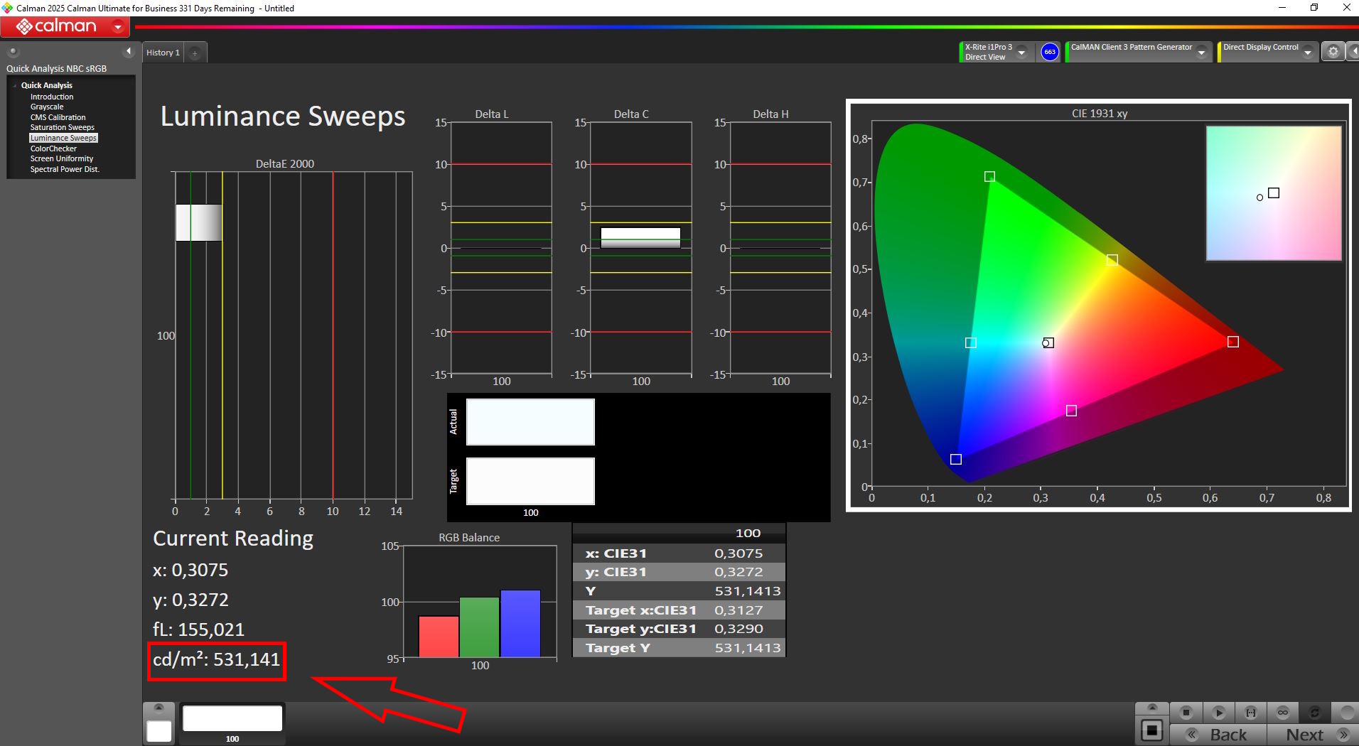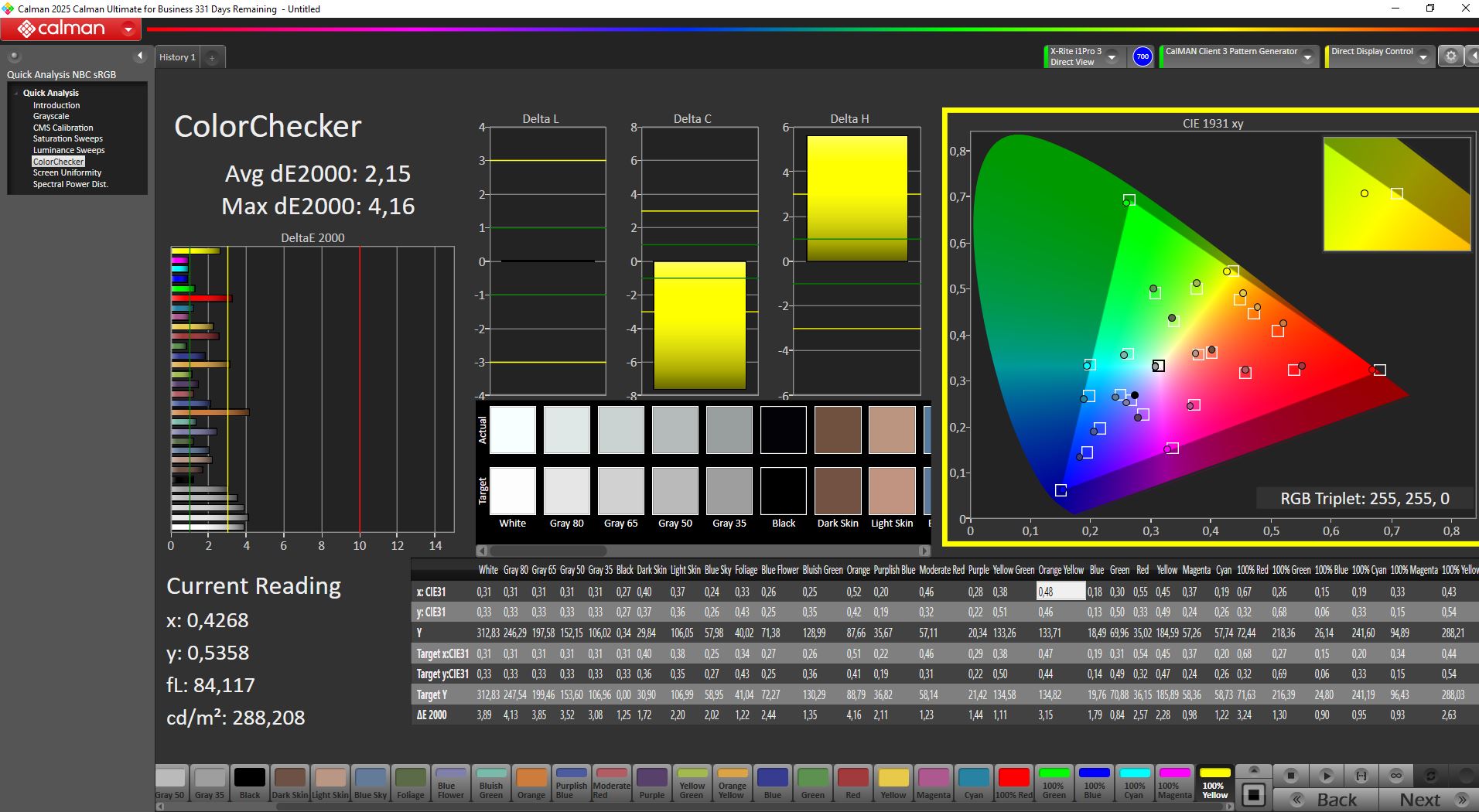 Kutudan çıktığında ekran oldukça iyi kalibre edilmişti. Manuel kalibrasyondan sonra gri tonlama ve renk sapmaları daha da azaltılarak ortalama 1,3 deltaE değerine ulaşıldı.