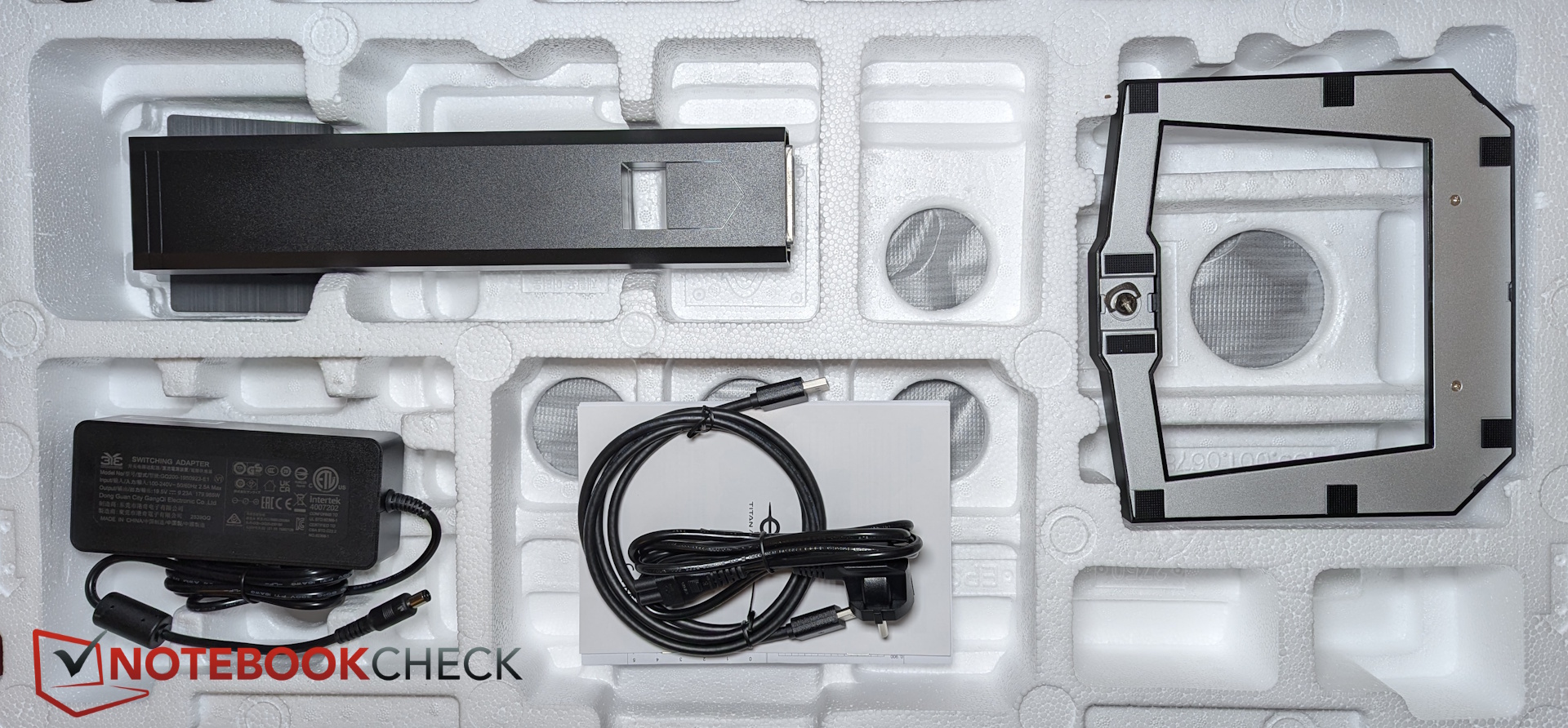 Kutu içeriğinde DisplayPort'tan DisplayPort'a kablo da yer alıyor. Ancak harici güç kaynağı oldukça büyük.