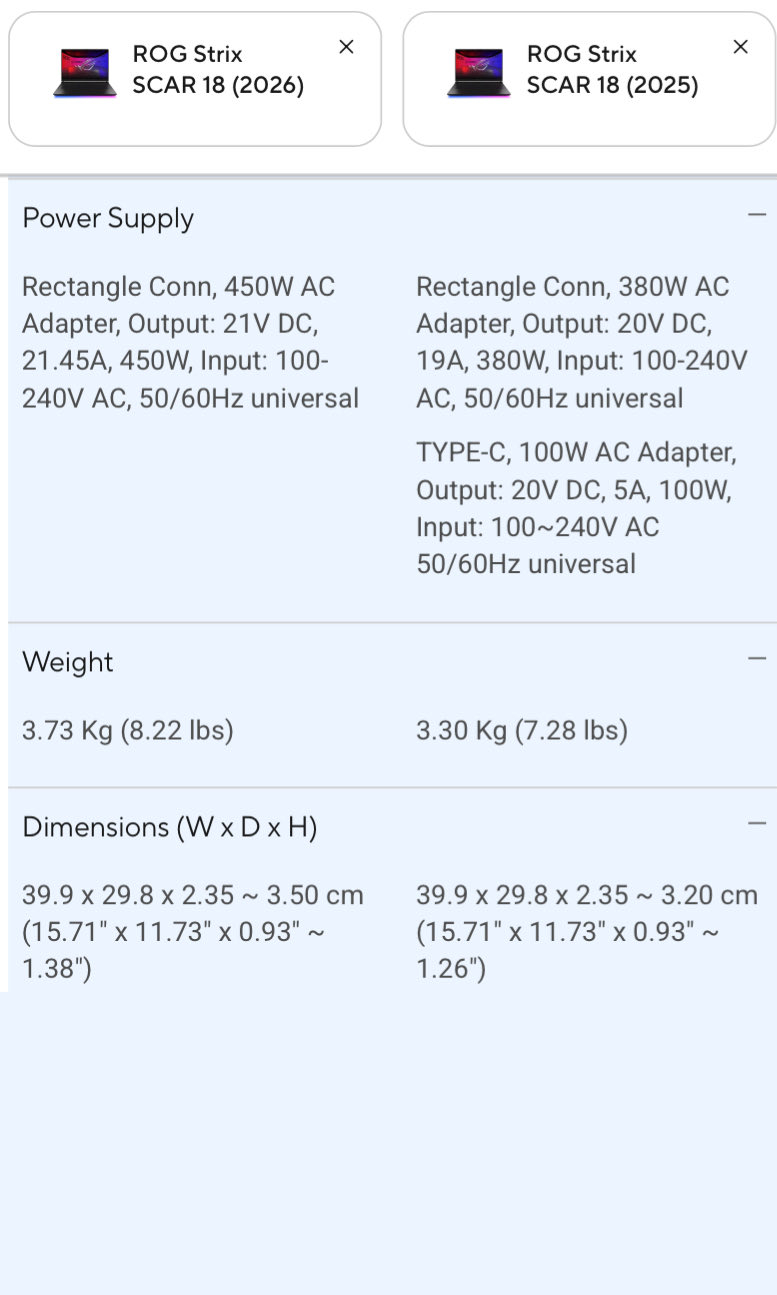 Bir yandan sızıntı, ROG Strix Scar 18'in (2026) yeni bir AC adaptörü aracılığıyla 450 W'a kadar güç çekeceğini gösteriyor. Hala dikdörtgen bir konektör olan yeni güç adaptörü, yeni Strix Scar 18'in selefinden farklı olarak bacaklarını tamamen uzatmasına izin verdiği için faturalandırıldı. Karşılaştırma görüntüsü ayrıca 2026 modelinin selefinden 430 g daha ağır olduğunu vurguluyor. Bu nedenle, geçen yılki modeli incelerken herhangi bir sorunla karşılaşmamış olmamıza rağmen, Asus'un daha güçlü bir soğutma çözümü de kurmuş olması muhtemel görünüyor.