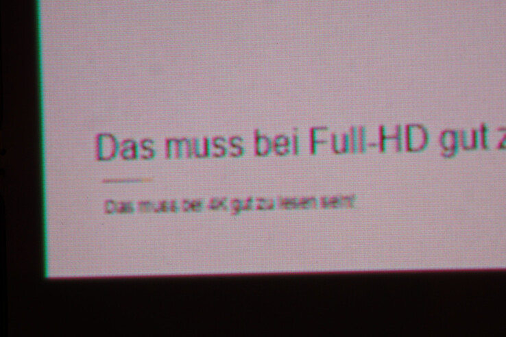 Öte yandan Awol Vision LTV-3500 Pro, aşağıda iki projektörün karşılaştırma görüntüsünde de açıkça görülebileceği gibi, duvara gerçekten 8 milyon piksel yansıtıyor. İlk görüntüde, tek tek pikseller tanınabilir, yazı tipi okunabilir ve ince rasterleştirme açıkça görülebilir. Sahte 4K çözünürlüğe sahip XGIMI projektör, Full HD görüntüyü net bir şekilde yeniden ürettiğinden tamamen farklıdır. Test görüntüsü aşağıda bulunabilir ve bağlantı üzerinden tam çözünürlükte görüntülenebilir ve yüklenebilir (metin görüntünün sol altındadır).