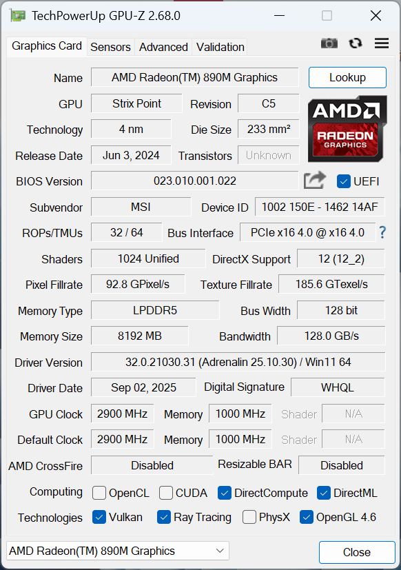 | MSI Claw A8 BZ2EM Ryzen Z2 Extreme, Radeon 890M, Micron 2500 1TB MTFDKBA1T0QGN, IPS, 1920x1200, 8" | Asus ROG Xbox Ally X Ryzen Z2 Extreme, Radeon 890M, Samsung MZVMA1T0HCLD, IPS, 1920x1080, 7" | GPD Pocket 4 Ryzen AI 9 HX 370, Radeon 890M, , IPS, 2560x1600, 8.8" | Zotac ZGC-G1A1W-01 R7 8840U, Radeon 780M, Phison PS5021-E21 512GB, OLED, 1920x1080, 7" | MSI Claw 8 AI+ Core Ultra 7 258V, Arc 140V, Kioxia BG6 KBG60ZNS1T02, IPS, 1920x1200, 8" | Lenovo Legion Go Z1 Extreme, Radeon 780M, WD PC SN740 512GB SDDPMQD-512G-1101, IPS, 2560x1600, 8.8" | Ortalama AMD Radeon 890M | Sınıf ortalaması Handheld / UMPC | |