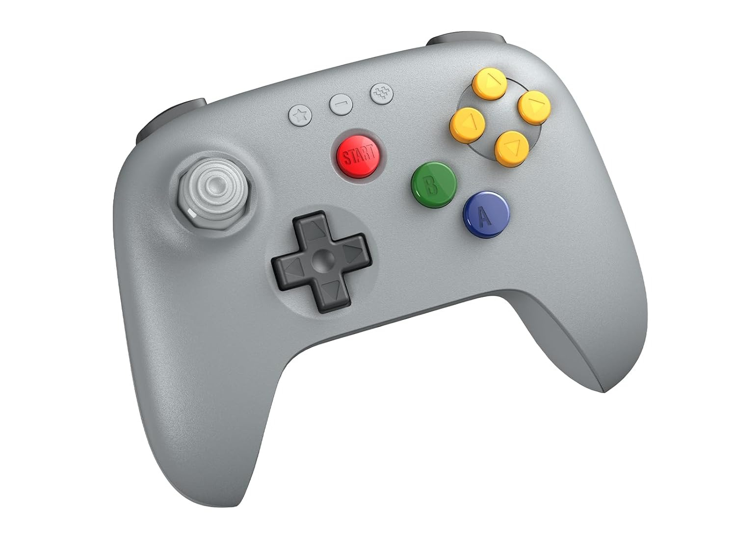 Gri 8BitDo 64 Bluetooth Kontrol Cihazı, gri kabuğu, sarı C düğmeleri, mavi A düğmesi, yeşil B düğmesi ve kırmızı başlat düğmesi ile orijinal Nintendo 64 kontrol cihazının rengine uyacak şekilde tasarlanmıştır. D-pad ile birlikte omuz düğmeleri ve tetikleyiciler koyu gridir.