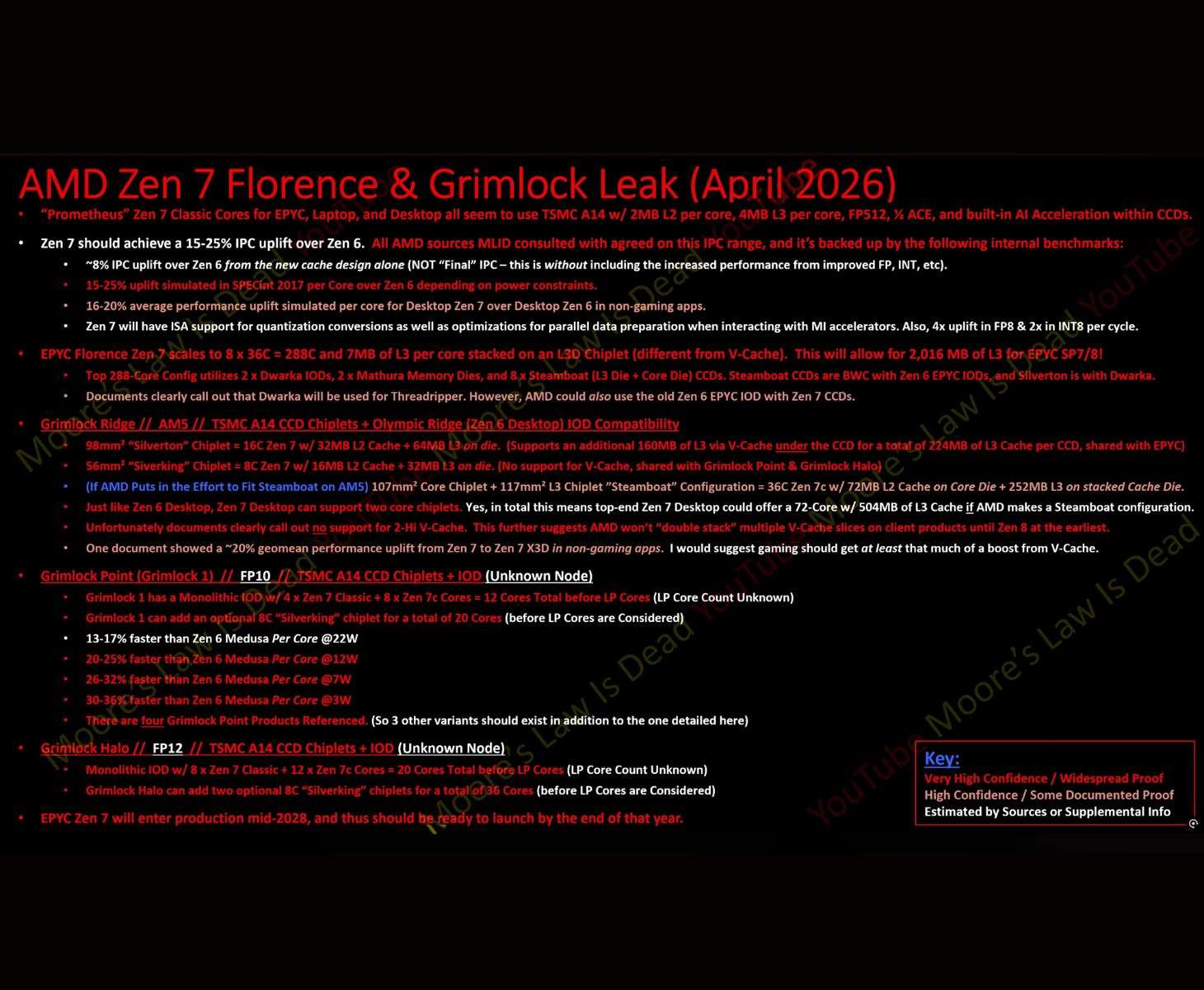 YouTube'da Moore's Law Is Dead programının sunucusu olan ünlü donanım sızdırıcısı Tom tarafından paylaşılan bir dizi slayta göre, AMD'nin Zen 7 EPYC amiral gemisiflorence kod adlı bu ürün, her ikisi de önemli tarihi ve manevi öneme sahip antik Hint şehirlerinin adını taşıyan iki adet "Dwarka" I/O kalıbı ve iki adet "Mathura" bellek kalıbını sekiz adede kadar 36 çekirdekli Steamboat CCD ile eşleştirerek soket başına 288 çekirdek elde ediyor.