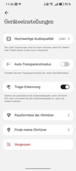 Bununla birlikte, zayıf yönleri de var: ANC aktifken pil ömrü sadece ortalama (yaklaşık 5,5 saat) ve LDAC + ANC kullanıldığında daha da azalıyor. ANC'nin kendisi, özellikle rüzgarlı veya çok gürültülü ortamlarda, her zaman tamamen ikna edici değildir. Ancak genel olarak Ear (3) tutarlı bir genel paket sunuyor.