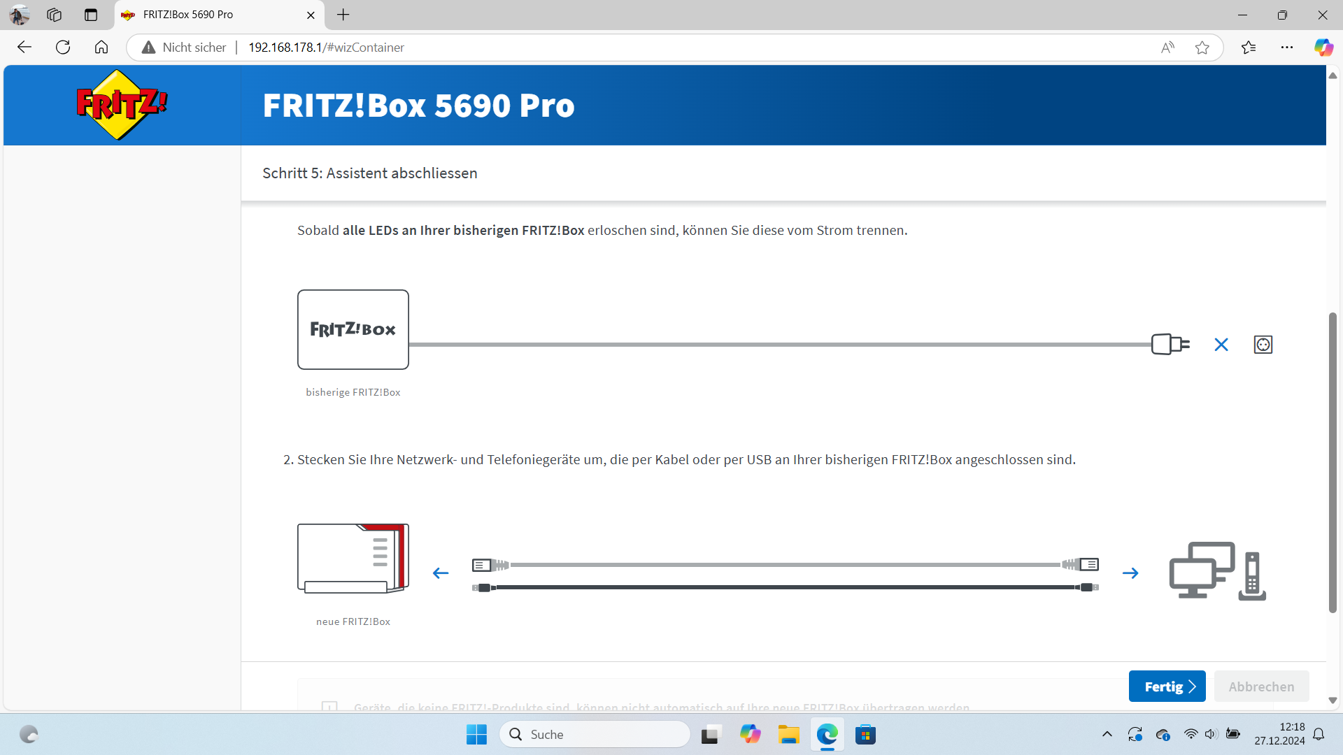 Taşıma işleminin devam edebilmesi için yeni Fritz!Box'ın fabrika ayarlarında olması gerekir. Eski cihazda, ayarların aktarımı Asistanlar - Ayarları yeni bir FRITZ!Box ' a aktar altında başlar. Adım adım görüntü kılavuzumuz 7590'dan 5690 Pro'ya geçişi belgelemektedir.