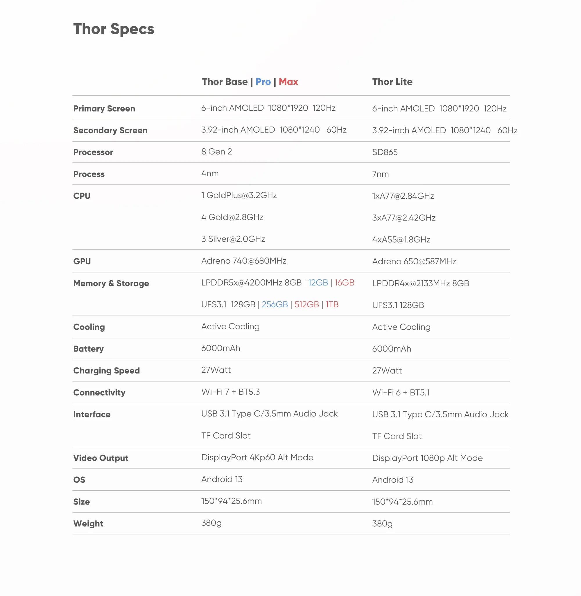 Depolama türündeki değişiklik Snapdragon 8 Gen 2-thor'un güçlendirilmiş versiyonu. Bunlar arasında 8GB RAM ve 128GB depolama alanına sahip Thor Base, 12GB RAM ve 256GB depolama alanına sahip Thor Pro ve 16GB RAM ve 512GB depolama alanına sahip Thor Max yer alıyor. Thor Lite'ın sahip olduğu Snapdragon 865 işlemci halihazırda UFS 3.1 depolama alanı kullanıyor ve kullanmaya devam edecek.