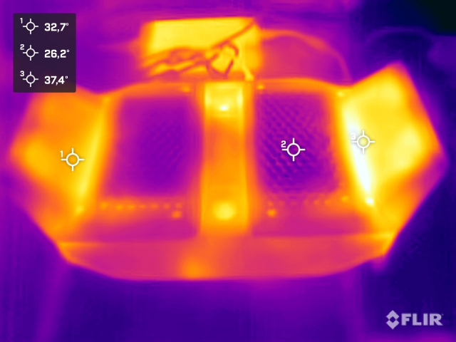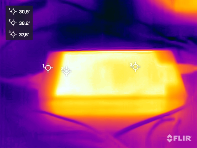 Acemagic, M2A Starship'e her zaman dönen dört fan takmıştır. Rölantide çalışırken mini PC yaklaşık 33 dB(A) ile hala oldukça sessiz. Ancak, yük altında ve oyun oynarken fanlar önemli ölçüde yükseliyor. Açıkça duyulabilen 53,9 dB(A)'lık bir zirveye ulaştık. Oyun oynarken ses seviyesi biraz düşüyor, ancak 49,3 dB(A) gerçekten sessiz değil. En azından fanlar rahatsız edici derecede yüksek bir frekans üretmiyor, bu da öznel gürültü seviyesinin biraz daha düşük olduğu anlamına geliyor.