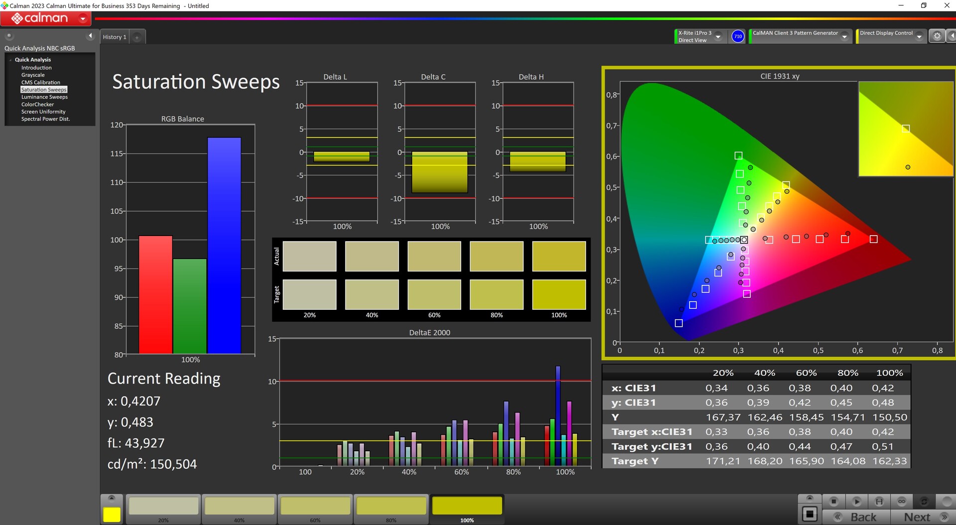 Panel kutudan çıkar çıkmaz kalibre edilmemişti ve hem gri tonlama hem de renkler için düşük doğruluk seviyeleri gösteriyordu. Ekranı manuel olarak kalibre etmek için Calman yazılımını ve X-Rite ölçüm cihazını kullanarak Delta E değerlerini önemli ölçüde düşürmeyi başardık ve ortalama fark 3,3'ten sadece 0,4'e düştü. Ancak renkler için iyileşme daha az önemliydi. Manuel kalibrasyonumuzdan sonra bile ortalama renk farkı 3'ün üzerinde kaldı. Örneğin mavinin Delta E değerinin 14 olması gibi aykırı değerler de vardı.
