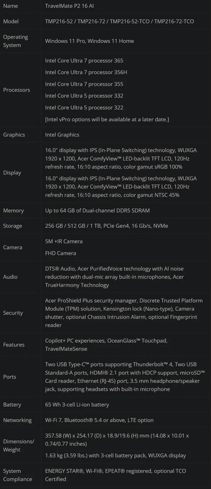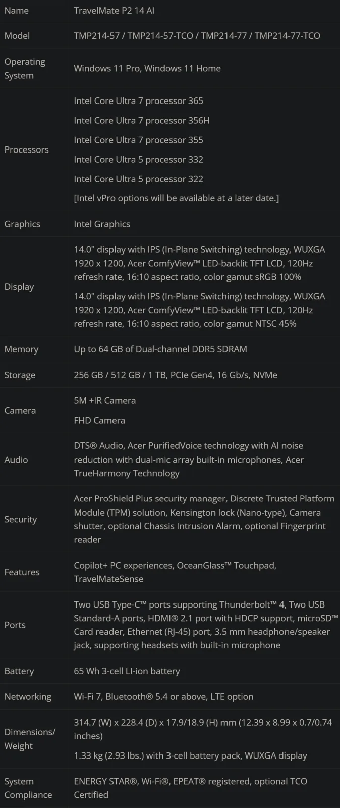 TravelMate P2 14 AI ve TravelMate P2 16 AI modelleri ise yüksek performans ve uzun pil ömrü arasında bir denge kuruyor. Bunlar, pili bir saatte %80'e kadar dolduran hızlı şarj teknolojilerine sahiptir, ancak 1920 x 1200 çözünürlükte sınırlandırılmış IPS ekranlarla donatılmıştır. Ayrıca Acer, bu iki model için isteğe bağlı LTE bağlantı modülleri de sunuyor.
