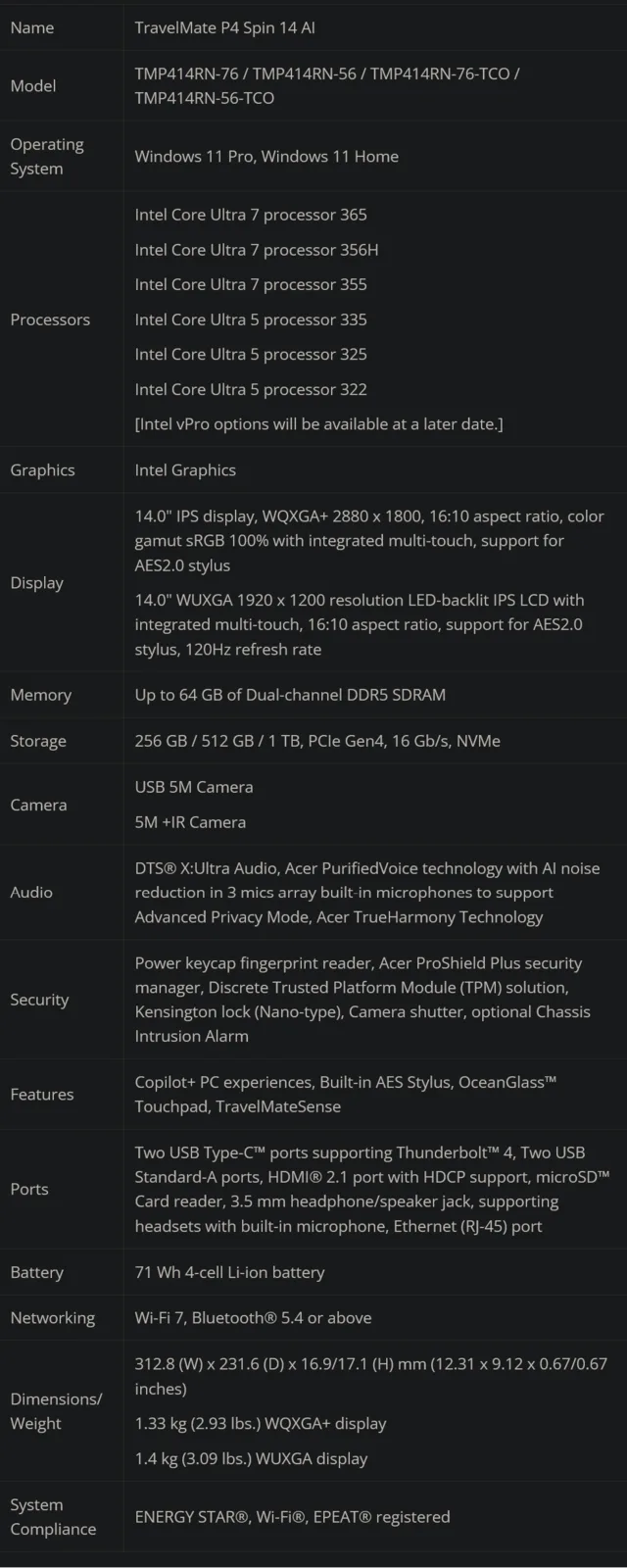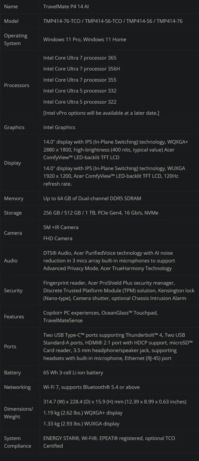 Yeniden tasarlanan yeni alüminyum kasa sayesinde TravelMate P4 14 AI ve TravelMate P4 Spin 14 AI modelleri önceki nesle kıyasla daha ince ve daha hafif bir deneyim sunuyor. Her iki model de 1920 x 1200 veya 2880 x 1800 IPS ekranlar, parmak izi sensörleri ve arkadan aydınlatmalı klavyelerin yanı sıra çift USB-C ve HDMI konektörleri aracılığıyla üç harici 4K monitör desteği ile donatılabiliyor. TravelMate P4 14 AI sadece 1,19 kg ağırlığındayken, TravelMate P4 Spin 14 AI dört yeni modelin tek dönüştürülebilir olanıdır ve 360 derece dokunmatik ekranın yanı sıra garajlı bir ekran kalemine sahiptir.