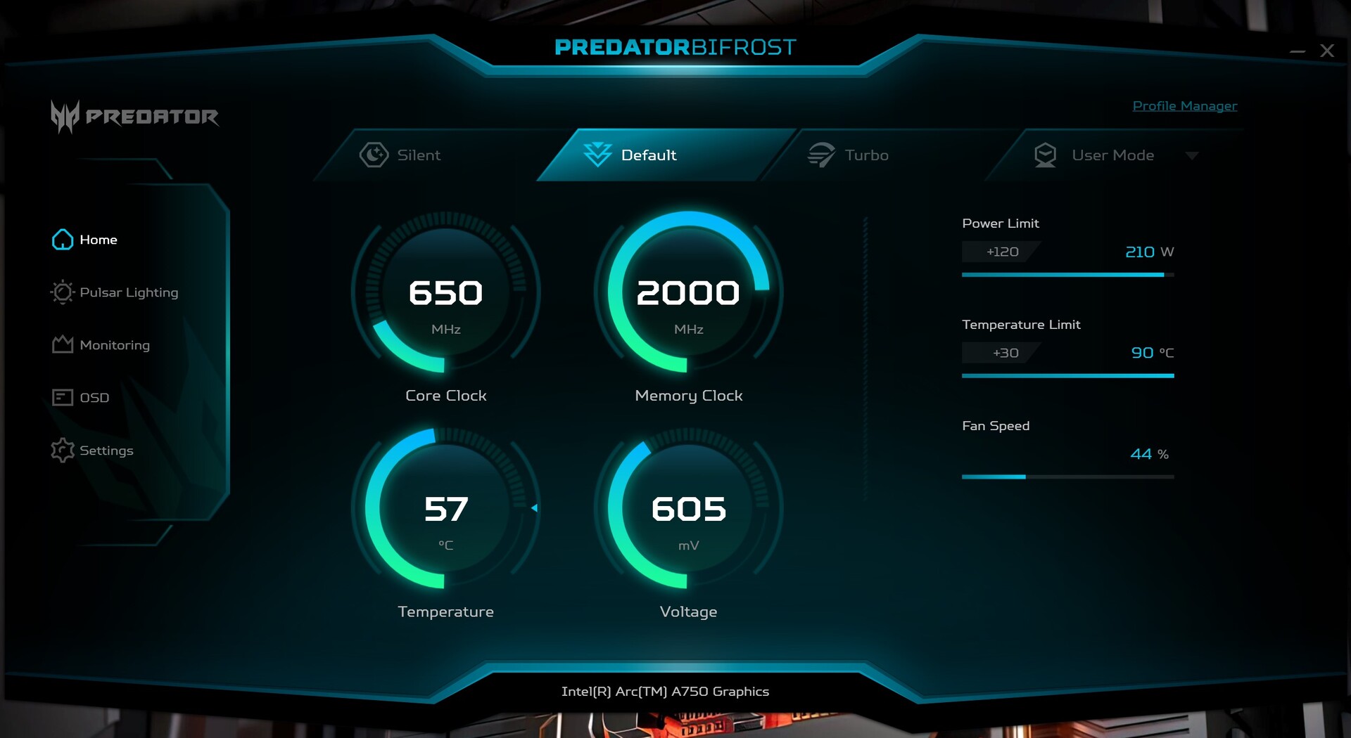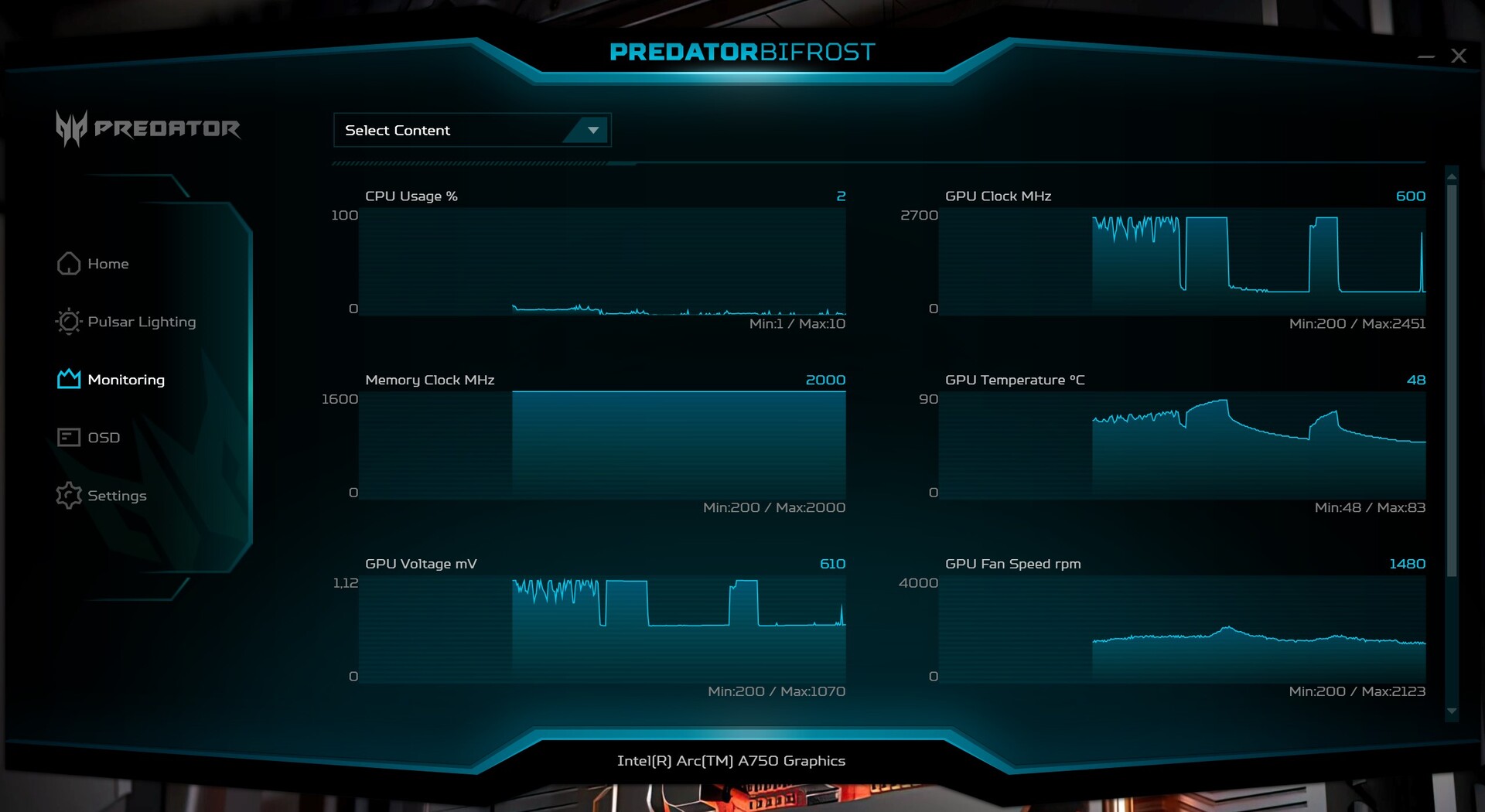 Acer Predator BiFrost Arc A750 OC'nin saat hızları