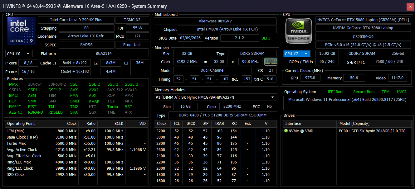 | Alienware 16 Area-51 Core Ultra 9 290HX Plus GeForce RTX 5080 Laptop, SK hynix PCB01 HFS001TFM9X186N, OLED, 2560x1600, 16" | Alienware 16 Area-51 Ultra 9 275HX, GeForce RTX 5080 Laptop, Samsung PM9C1a MZ9L81T0HDLB, IPS, 2560x1600, 16" | Lenovo Legion Pro 7i 16 Gen 10 Ultra 9 275HX, GeForce RTX 5080 Laptop, SK Hynix HFS001TEJ9X115N, OLED, 2560x1600, 16" | HP Omen Max 16 ah000 Ultra 9 275HX, GeForce RTX 5090 Laptop, WDC PC SN810 2TB, OLED, 2560x1600, 16" | MSI Vector 16 HX AI A2XWHG Ultra 7 255HX, GeForce RTX 5070 Ti Laptop, Micron 2400 MTFDKBA512QFM, IPS, 2560x1600, 16" | Asus ROG Zephyrus G16 GU605CW Ultra 9 285H, GeForce RTX 5080 Laptop, Micron 2500 2TB MTFDKBA2T0QGN-1BN1AABGA, OLED, 2560x1600, 16" | |