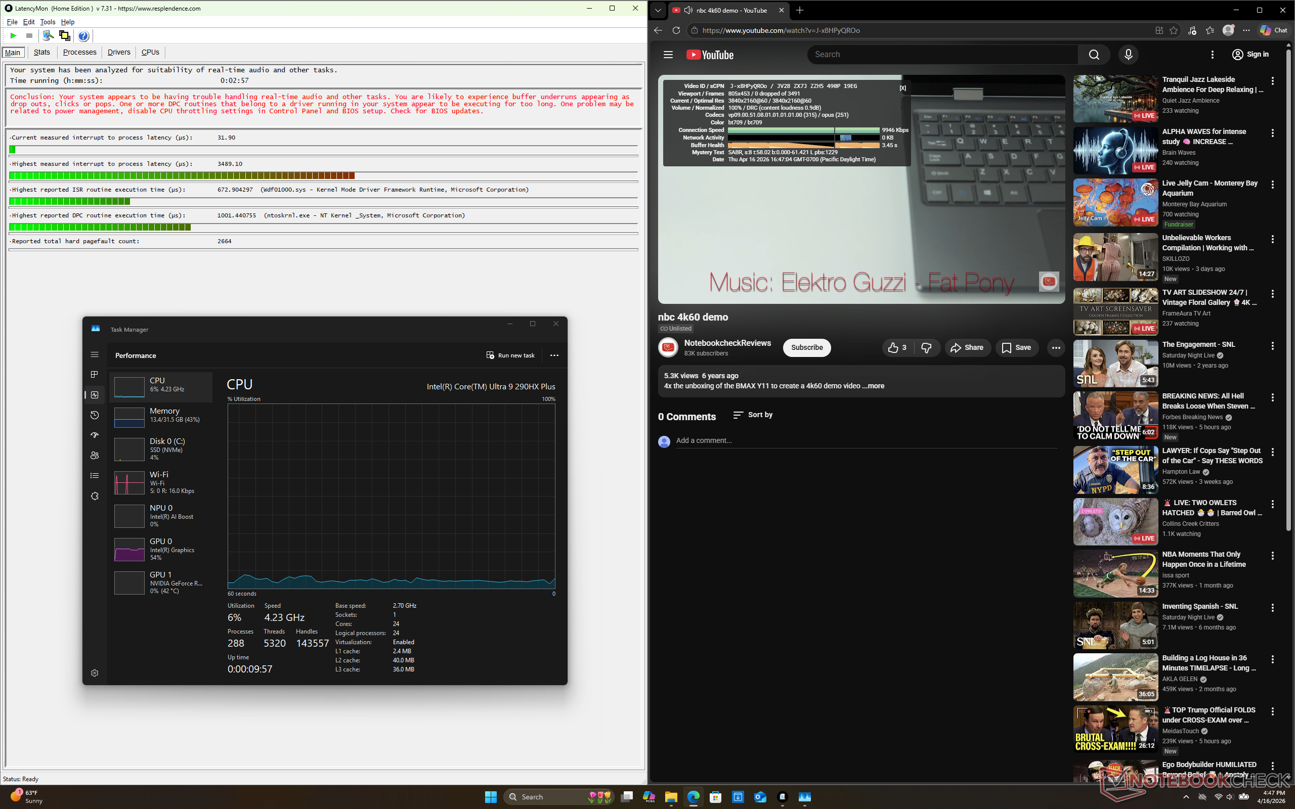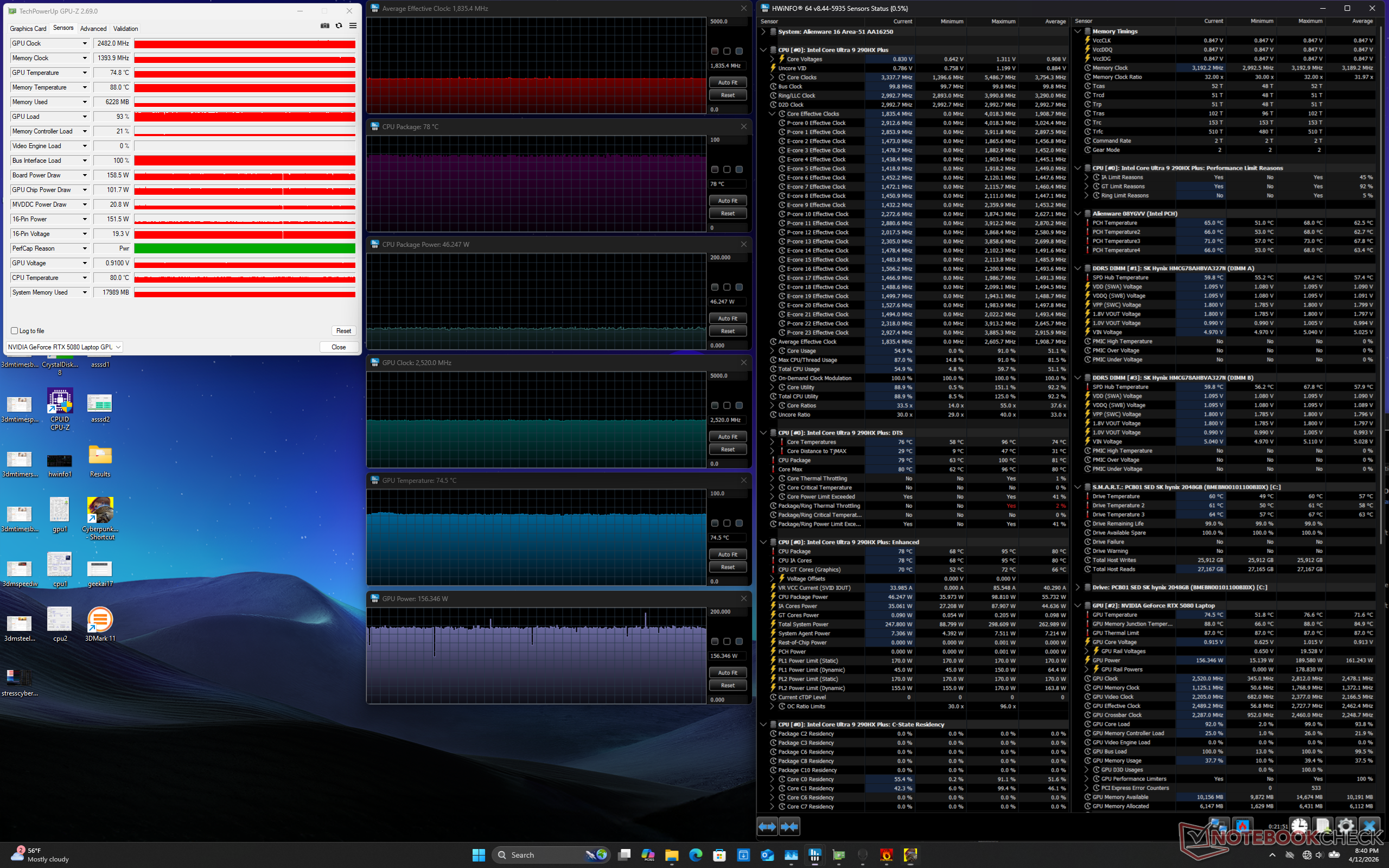 Prime95 stresini Overdrive modunda (yani maksimum fan modunda) çalıştırırken, CPU 4,3 GHz, 182 W ve 105 C'ye (!) yükselir ve 95 C ila 100 C arasında biraz daha soğuk bir çekirdek sıcaklığını korumak için hafifçe 3,9 ila 4,1 GHz aralığına düşer. Karşılaştırıldığında, aynı testi 2025 Alienware 16'da çalıştırmak, sırasıyla 3,6 GHz ve 92 C'lik daha düşük bir ortalama CPU saat hızı ve sıcaklığı ile sonuçlanır. Core Ultra 9 290HX Plus'ın mevcut Alienware 16 soğutma çözümünü mutlak sınırlarına kadar zorladığı açıktır.