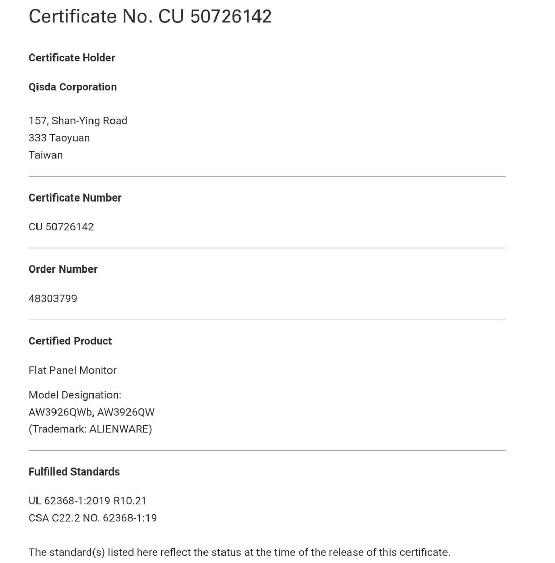 Özellikle, yakın zamanda alınan bir TÜV Rheinland sertifikası Dell'in AW3926QW model numarasını taşıyan yeni bir Alienware monitör geliştirdiğini ortaya çıkardı. Alienware'in isimlendirme şemasına göre AW3926QW 39 inçlik bir monitör. Bu anlamda, AW3926QW aşağıdakilerden önemli ölçüde daha büyük olacaktır AW3425DWdell'in bir yıldan biraz daha uzun bir süre önce küresel olarak piyasaya sürdüğü.
