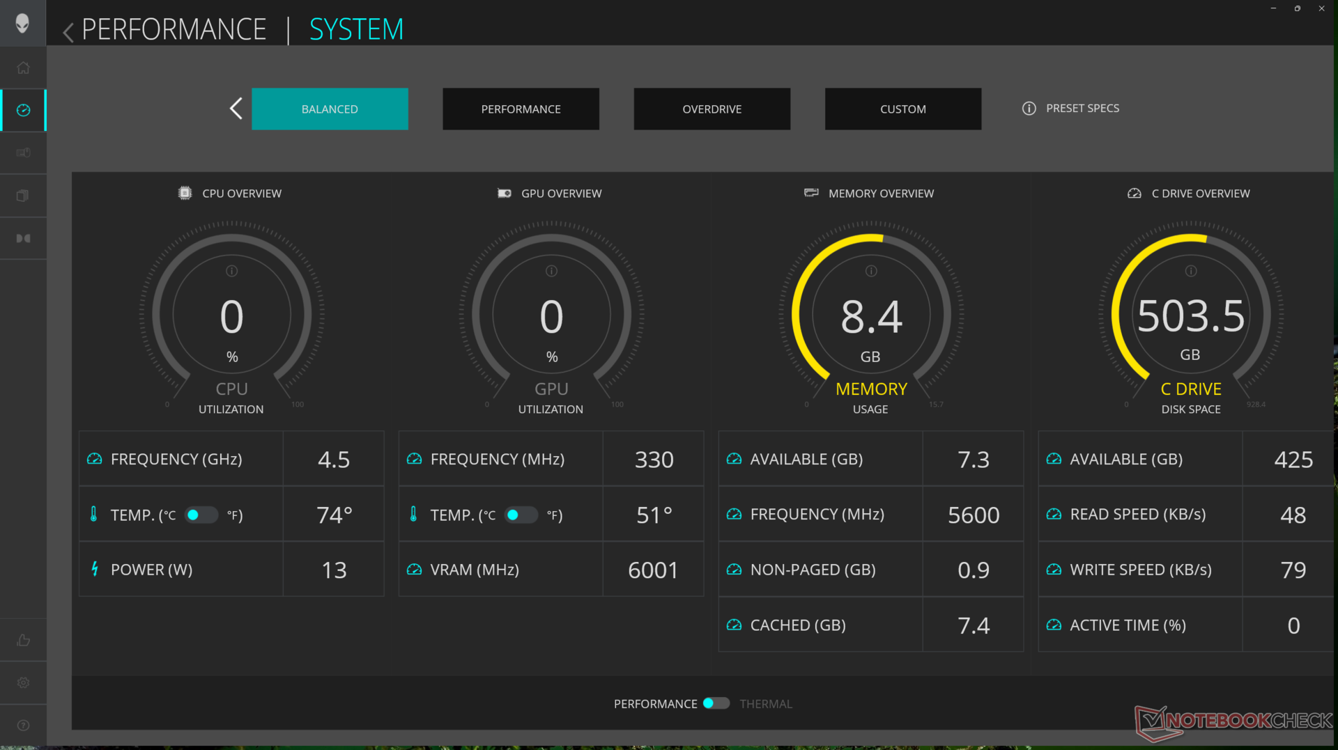 Masaüstünde rölanti, Sessiz modda ve iGPU modunda minimum parlaklığa ayarlandığında 8 W kadar düşük olabilir veya Overdrive modunda ve dGPU modunda maksimum parlaklığa ayarlandığında 40 W'a kadar çıkabilir. Bir sonraki bölümde gösterildiği gibi pil ömrünü uzatmak için ekstra beygir gücüne ihtiyaç duyulmadığında Dengeli modda ve iGPU modunda olmak isteyeceksiniz.