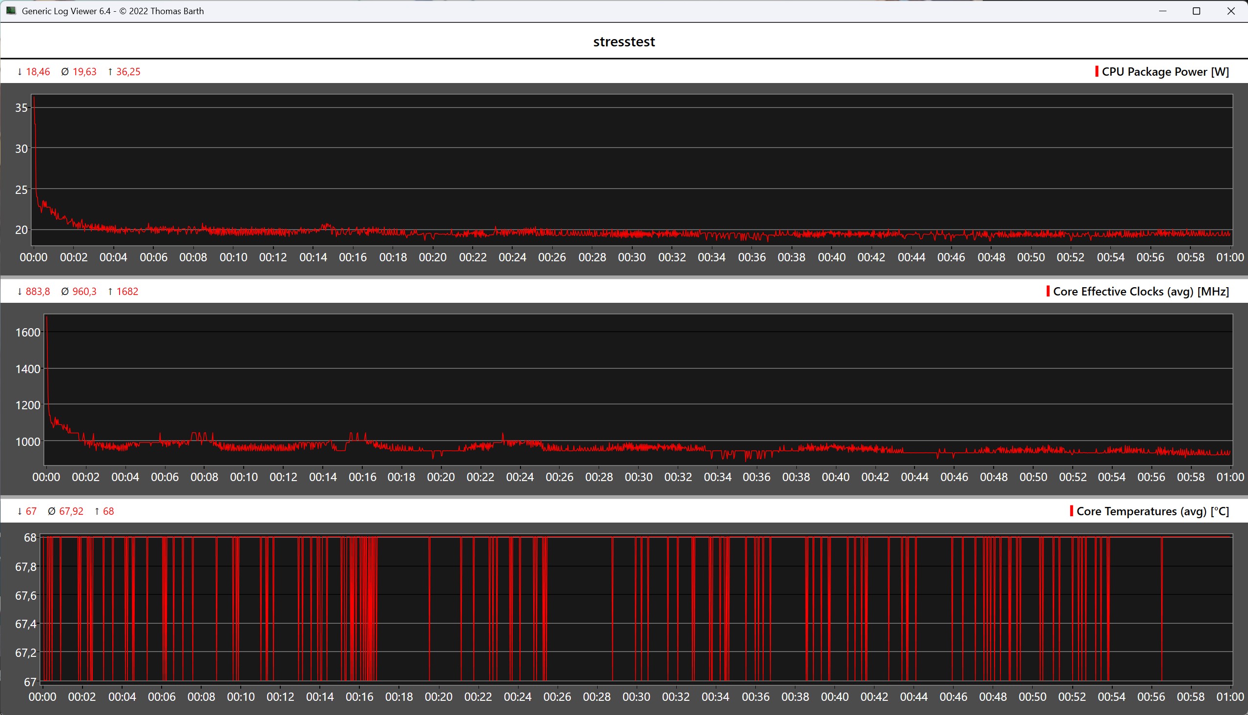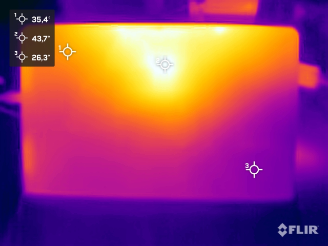 IWork GT Ultra'nın yüzey sıcaklıkları genel olarak kritik değil. Tam yük altında, arka tarafta maksimum 46 °C civarında bir sıcaklık ölçtük, bu da günlük kullanımda fark edilebilir ancak rahatsız edici değil. Kombine CPU ve GPU yükü ile yapılan stres testinde, SoC kısa bir süre için yaklaşık 36 watt'lık bir güç tüketimine ulaştıktan sonra hızla yaklaşık 19 watt'ta dengeleniyor.