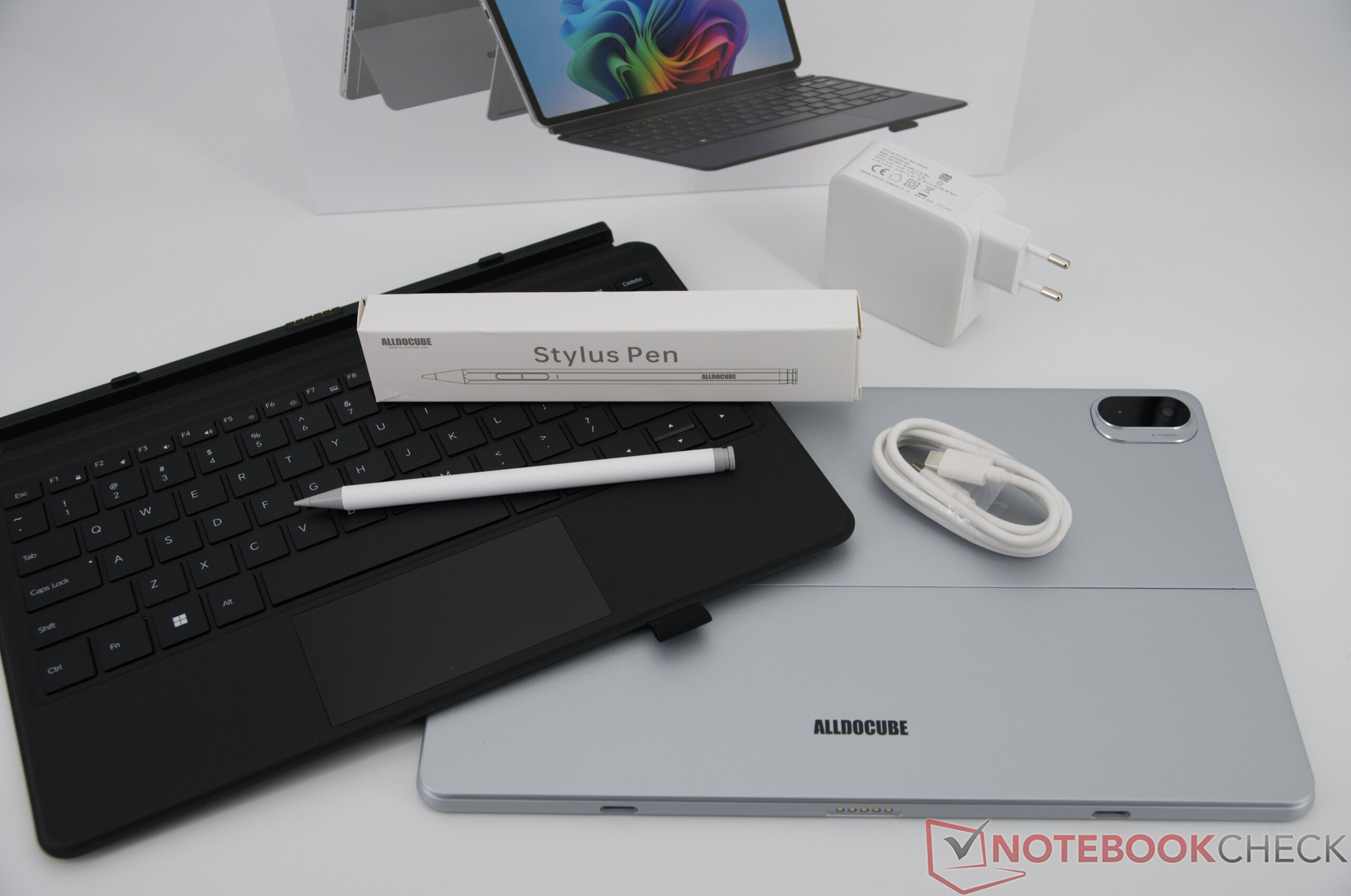 Teslimat kapsamına, alt tarafa manyetik olarak tutturulmuş bir klavye kapağı dahildir. Üst kısım, pratikte güvenilir bir şekilde çalışan ve aynı zamanda ek koruma sağlayan bir stand olarak hizmet vermek üzere katlanabilir. İsteğe bağlı klavye kapağı alt tarafa yerleştirilmiştir, ancak özellikle güvenli değildir ve nispeten kolay bir şekilde gevşeyebilir. Tabletin kendisi yaklaşık 10 mm yüksekliğinde ve yaklaşık 870 gram ağırlığındadır. Ancak klavye ile ağırlık önemli ölçüde artıyor ve toplam yükseklik de biraz yükseliyor. Birlikte verilen güç kaynağı 240 gram ağırlığındadır.