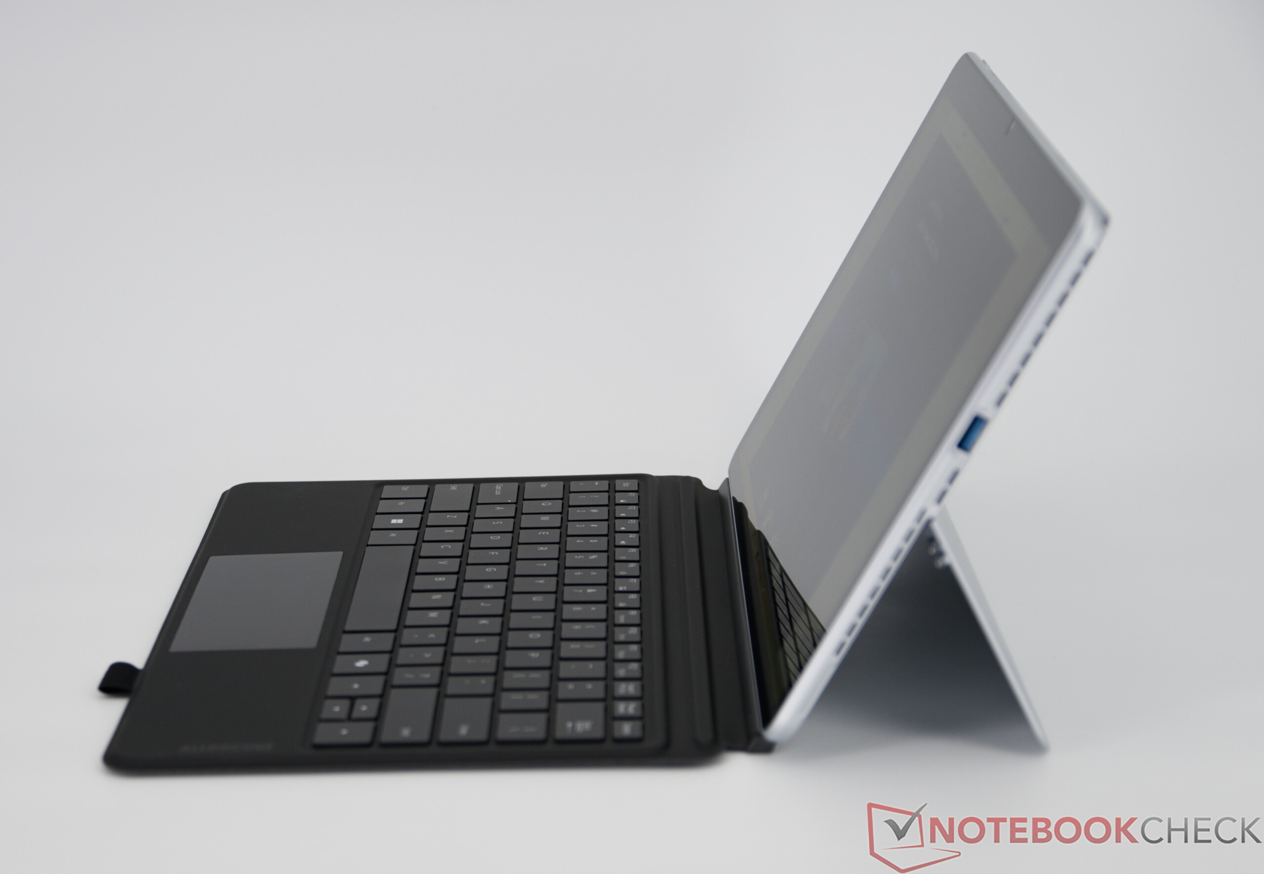 İsteğe bağlı klavye kapağının arka ışığı var, ancak tuş hareketi oldukça sığ ve girişler biraz daha yüksek. Genel olarak, yazma hissi yine de sağlam ve ekran klavyesinden açıkça daha hoş. Bununla birlikte, yalnızca İngilizce düzeninin mevcut olduğu unutulmamalıdır. Olumlu bir özellik, zayıf aydınlatma koşullarında çalışmayı kolaylaştıran beyaz arka ışıktır. Entegre ClickPad oldukça küçüktür, ancak günlük kullanımda amacına hizmet eder.