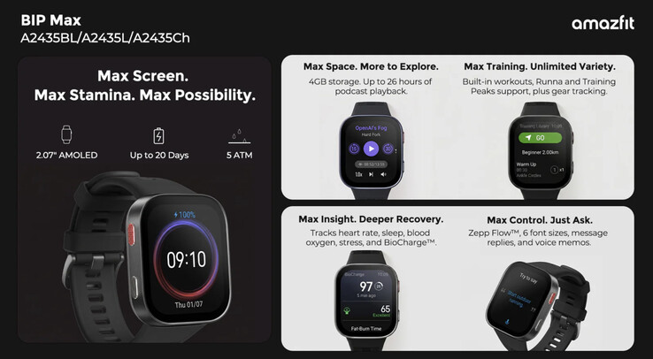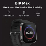 Sızdırılan bu görüntülere göre Bip Max, 3.000 nit AMOLED ekran ve 20 güne kadar pil ömrüyle Cheetah 2 Pro ile eşleşecek. Bip Max 2,07 inçlik bir ekrana sahip olsa da bu ekran Cheetah 2 Pro'dan 2 mm daha küçük bir kasa boyutuna sahip. Amazfit, Cheetah 2 Pro'daki 32 GB'a kıyasla 46 mm'lik yeni akıllı saatine 4 GB depolama alanı dahil etti.