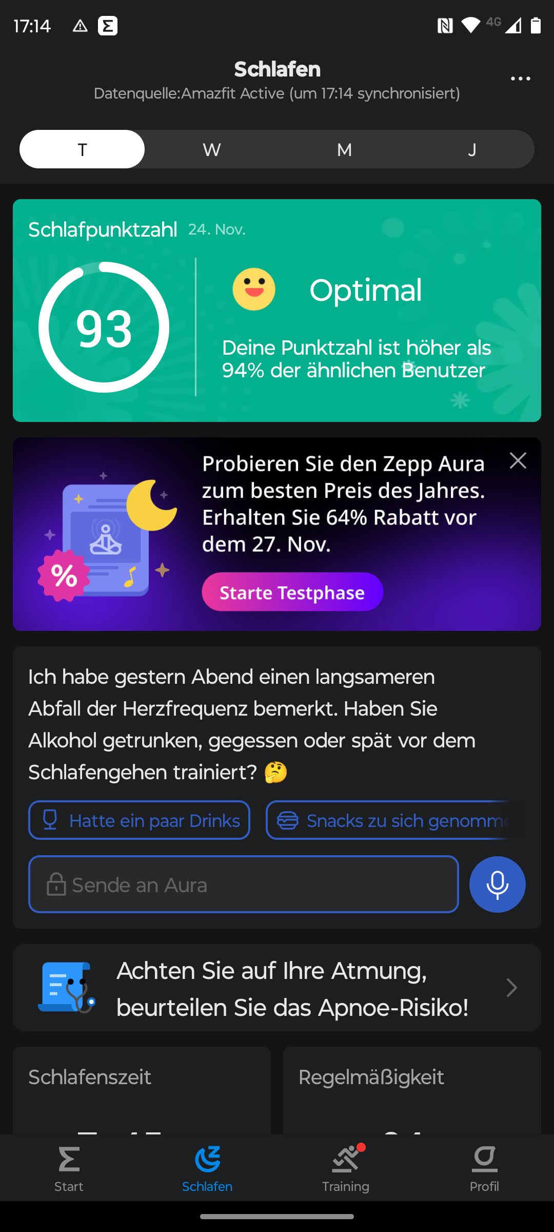 Aura, öncelikle uyku ile ilgili işlevlere odaklanan yapay zeka destekli bir asistan. Haftalık istatistiklerin veya derin uyku evrelerinin analizlerini sağlamanın ötesinde, Aura bir sohbet robotu olarak çalışır. Yazılı yanıtlar Almanca olarak mevcut olsa da, dil sürümü şu anda İngilizce ile sınırlıdır. Aura rahatlamak için müzik öneriyor ve kişiselleştirilmiş bir uyku planı tasarlıyor. Bu hizmetin fiyatı aylık ~10 ABD Doları ya da yıllık ~75 ABD Doları ve yedi günlük ücretsiz deneme süresi sunuluyor. Aura sanal asistanının bulutta depolandığını ve akıllı telefonun ötesinde veri analizine izin verdiğini belirtmek gerekir.