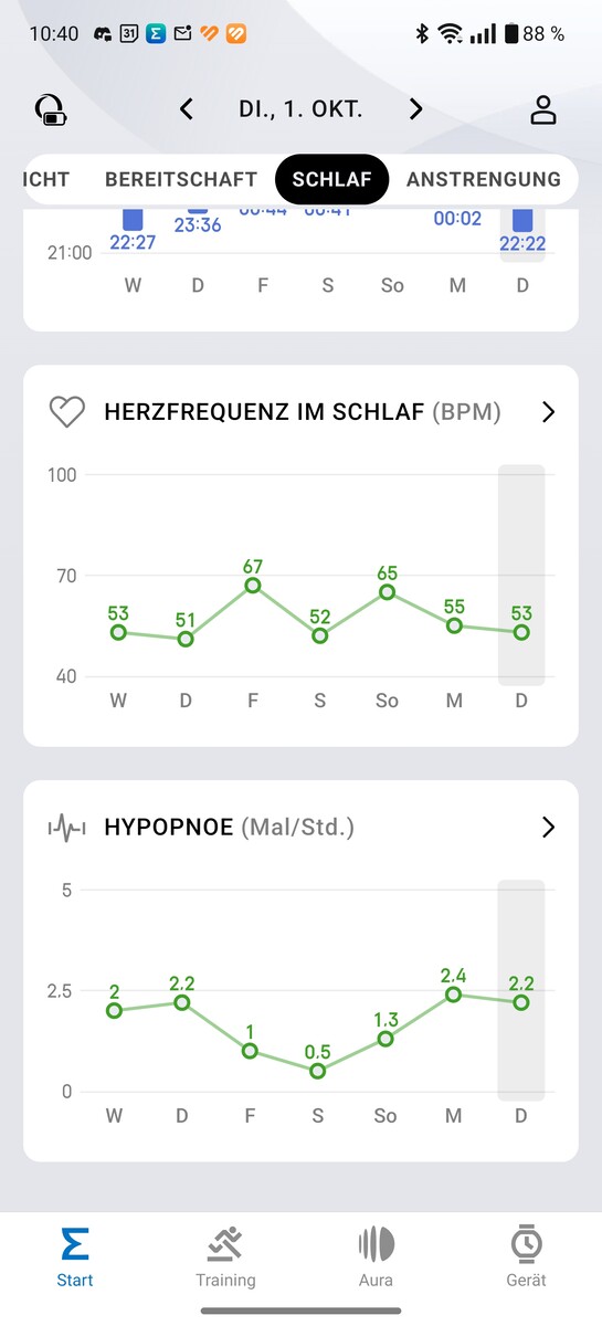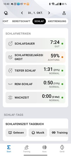 Geceleri bileğinize bir akıllı saat takmak can sıkıcı olabilir, bu nedenle Amazfit Helio Ring mantıklı bir alternatiftir. Kaydedilen veriler arasında uyku süresi, düzenliliği, derin ve REM uykusu ve uyanma zamanları yer alıyor. Kayıtların tutarlı olduğunu, sadece küçük uyanma aşamalarının her zaman tanınmadığını görüyoruz.