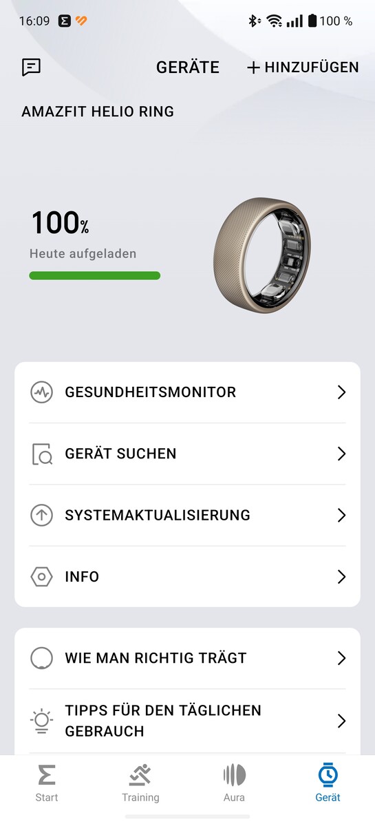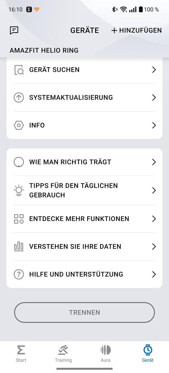 Uygulama, T-Rex 3 gibi Amazfit akıllı saatlerle aynı şekilde çalıştırılır. Helio Ring için ayarlar Cihaz sekmesi altında bulunmaktadır. Diğer şeylerin yanı sıra, sağlık izleme burada yapılandırılabilir. Ancak, Amazfit yüzüğün ne bir titreşim motoru ne de bir hoparlörü olduğundan, arama işlevi yalnızca görseldir, bu nedenle iç kısımdaki LED'ler bunun yerine yeşil renkte yanar.