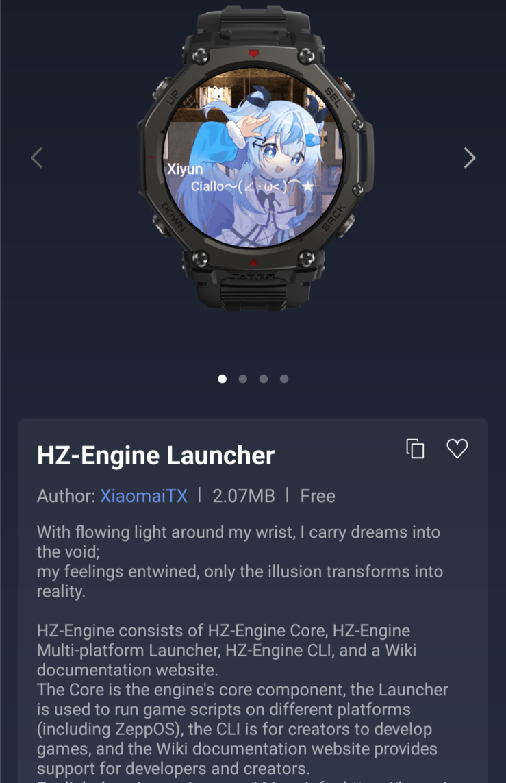 Zepp OS Weekly Top 50 Downloaded Apps tablosuna göre en popüler yeni uygulama HZ-Engine Launcher. Başlatıcı, Zepp OS üzerinde görsel roman motoru için oyun komut dosyalarını çalıştırmak için kullanılabilir. Son zamanlarda eklenen diğer popüler uygulamalar arasında Telegram istemcisi tgwatch ve "minimalist akıllı saat sohbet uygulaması" olarak tanımlanan CaferoChat yer alıyor.