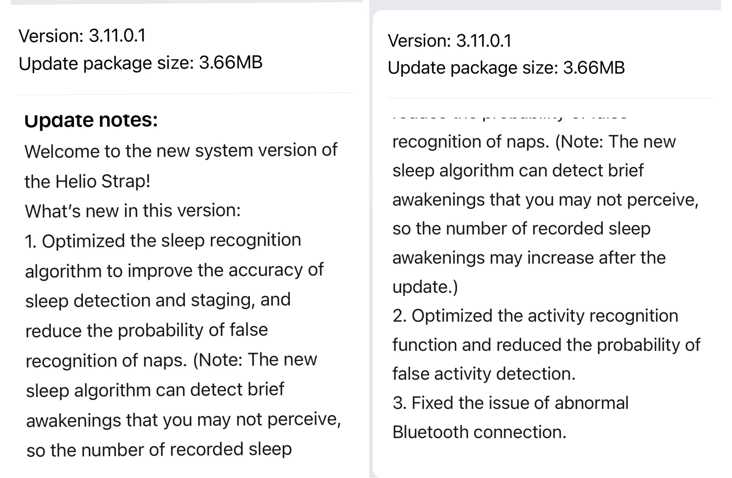 Aygıt yazılımı sürümü 3.11.0.1 ile Reddit'te şunları bildirdiamazfit Helio Strap kullanıcıları iki iyileştirme elde ediyor. İlk olarak, uyku tanıma algoritmasının daha fazla uyku tespiti ve uyku aşaması doğruluğu için optimize edildiği söyleniyor. Ancak Amazfit, bu değişikliğin bir sonucu olarak genel uyanıklık dönemlerinin sayısının artabileceğini belirtiyor. Aynı zamanda, bir şekerlemenin yanlış kaydedilme olasılığı azaldı.