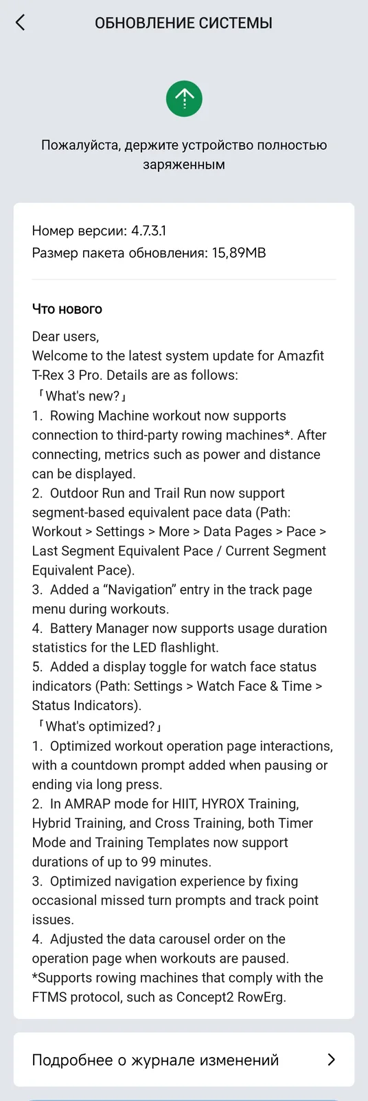 Ürün yazılımı sürümü 4.7.3.1 ile T-Rex 3 Pro kullanıcıları artık FTMS uyumlu bir üçüncü taraf kürek makinesini akıllı saate bağlayarak Kürek Makinesi antrenmanları sırasında güç ve mesafe ölçümlerini toplayabilir. Outdoor Run ve Trail Run aktiviteleri için artık segmente göre eşdeğer tempo verilerini görüntüleyebilirsiniz. Antrenman ortası parkur sayfası menüsünde yeni bir Navigasyon bölümü var. Ayrıca, Amazfit akıllı saatin Pil Yöneticisi artık giyilebilir cihazın entegre LED el feneriyle bağlantılı verileri görüntüleyebiliyor.