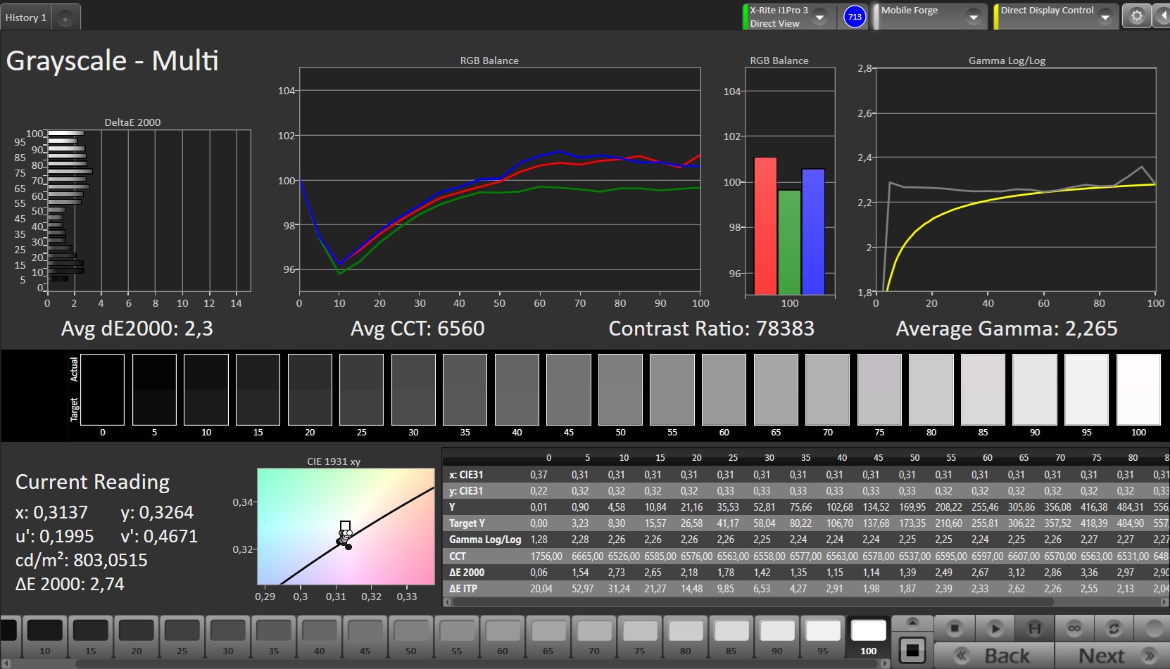Ekran renk kalibrasyonu Calman analiz yazılımı ve bir fotospektrometre kullanılarak değerlendirilmiş ve referans değerlerden sadece küçük sapmalar ortaya çıkmıştır.