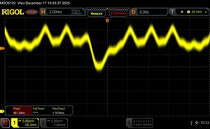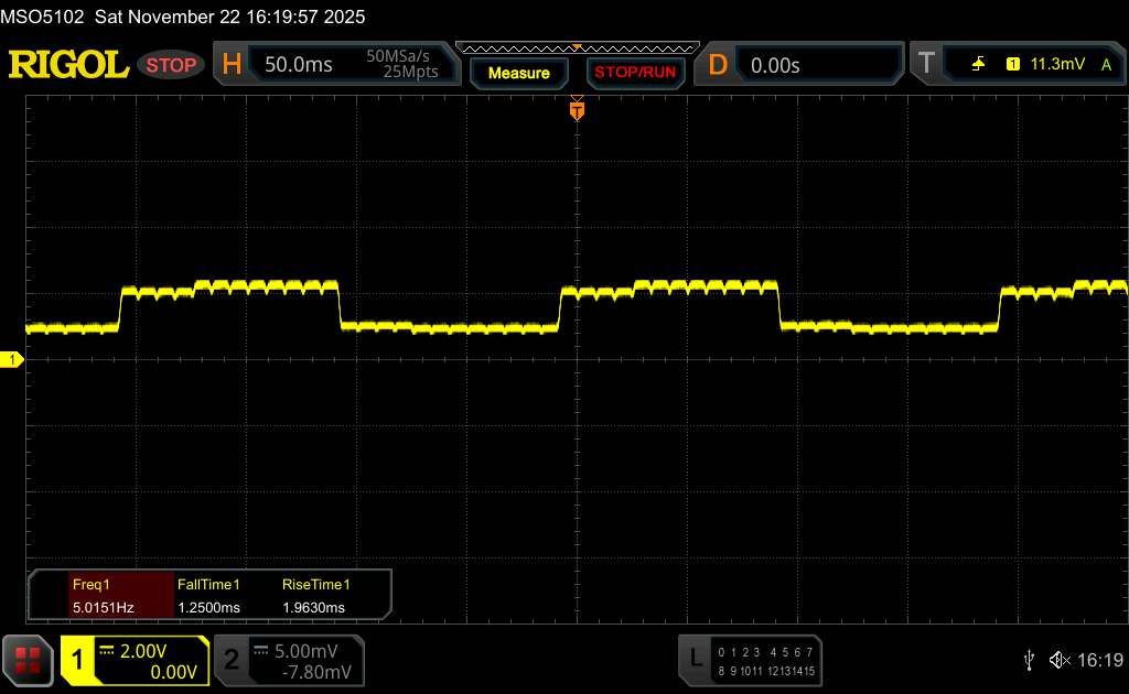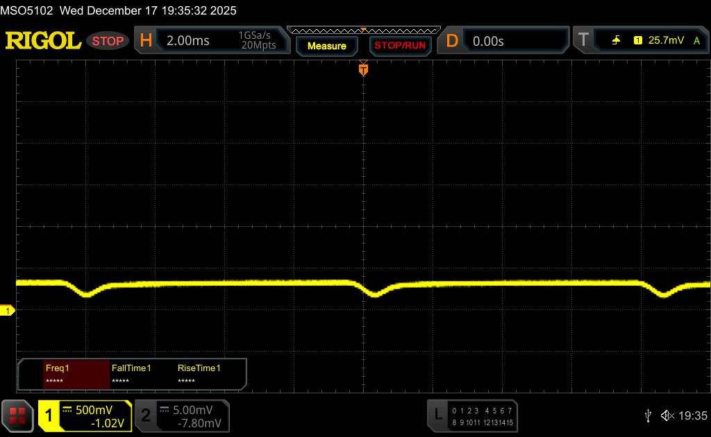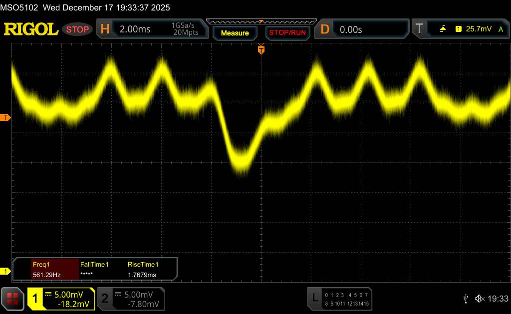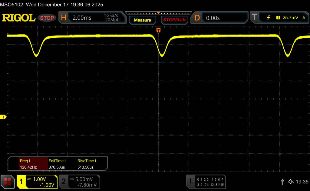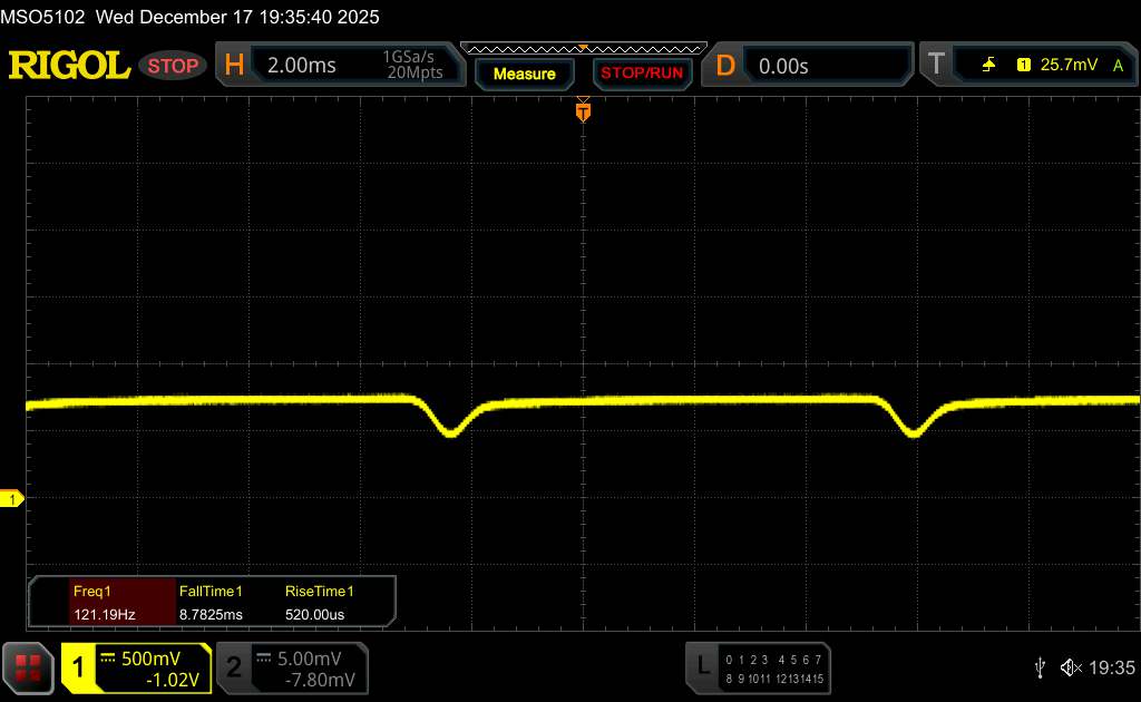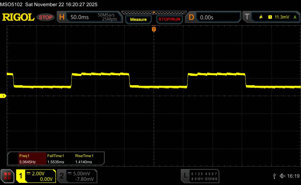 Bu bir OLED panel olduğundan, parlaklık darbe genişlik modülasyonu ile kontrol edilir. Üreticiye göre iQOO 15, görünür titreme gibi potansiyel olumsuz etkileri azaltmak için 2.160 Hz'de yüksek frekanslı PWM karartma kullanıyor. Rigol yazılımını kullanarak yaptığımız ölçümler 560 Hz civarında bir temel frekansa işaret etmektedir.