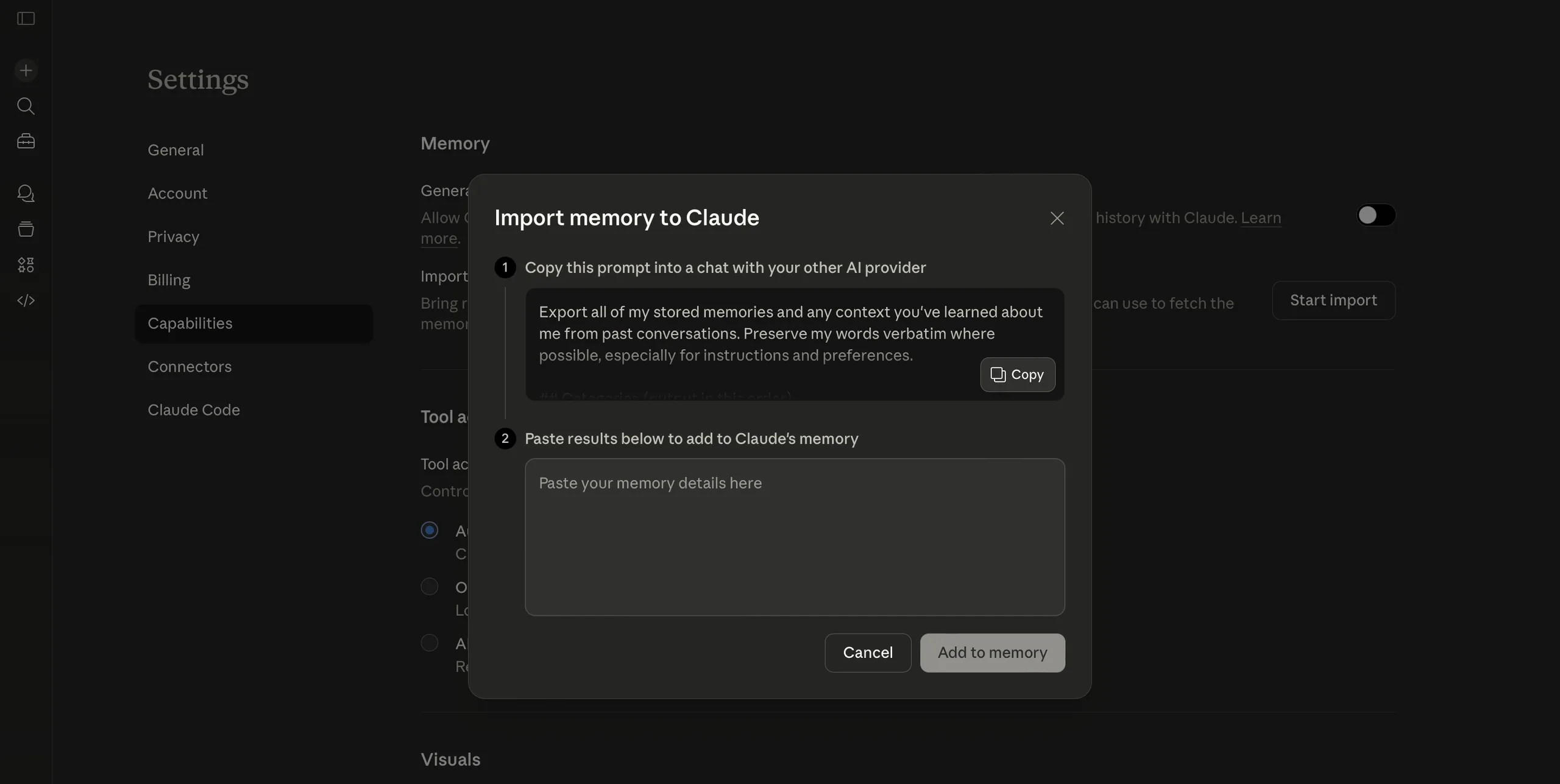 Modern yapay zeka sohbet robotlarının en önemli avantajlarından biri, konuşma geçmişine dayalı olarak kullanıcı tercihlerini ve gereksinimlerini öğrenme yetenekleridir. Bu veriler özel bir komut istemi yardımıyla çıkarılabilir ve çıktı daha sonra farklı bir sohbet robotuna beslenebilir. Bu araç Anthropic tarafından bellek içe aktarma olarak adlandırılıyor ve Claude'un ayarları içinde mevcut.