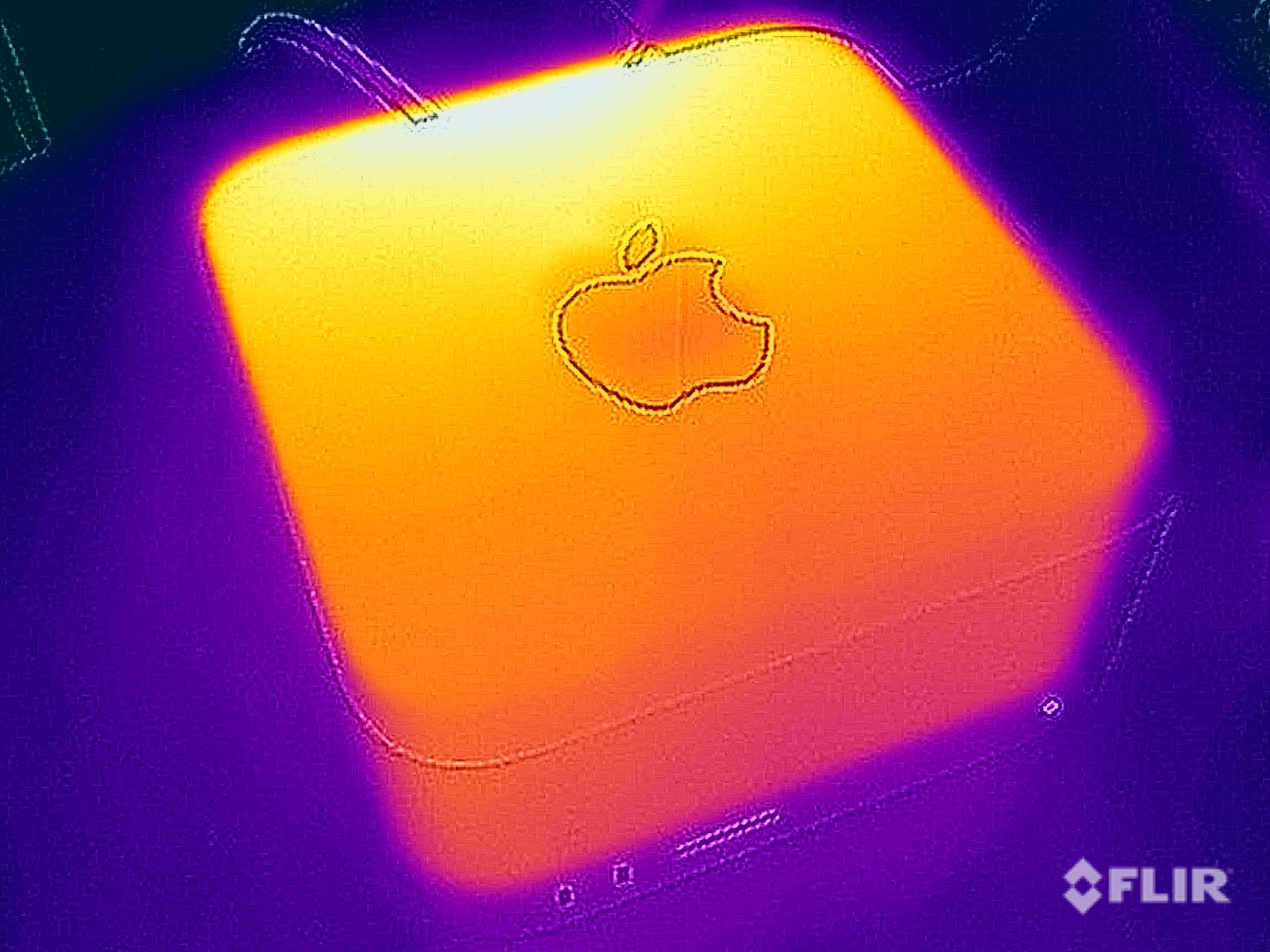 Elbette bir masaüstü bilgisayarda yüzey sıcaklıkları bir dizüstü bilgisayara kıyasla çok önemli değildir, ancak yine de Mac Studio'nun endişelenecek bir yanı yok. Günlük kullanımda kasa neredeyse hiç değişmedi ve bir saatlik stres testimizden sonra bile üstte maksimum 38 °C ve fan çıkışında 42 °C ölçtük. Bunlar tamamen sorunsuz sıcaklıklar.