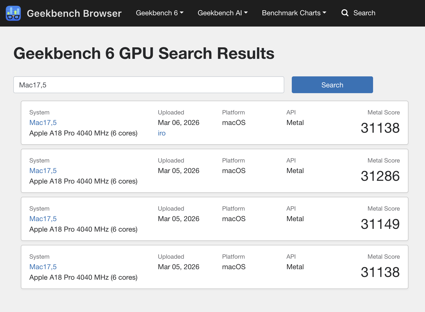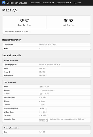 Bir yandan, GPU performansı M1 destekli MacBook Air'in biraz ilerisinde görünüyor 2020'de gözden geçirdik. O sırada bu cihaz Geekbench 6.5 Metal kıyaslamasında ortalama 30,112 değerini elde etmişti. Bu arada MacBook Neo, şimdiye kadar listelenen kıyaslamalardan 31.178 sonuç elde etti. Bu sonuç, Türkiye'nin %5,7 gerisinde kalmaktadır iPhone 16 Pro Max 16,6 daha az GPU çekirdeği içermesine rağmen.