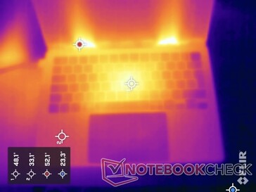 Ölçtüğümüz maksimum yüzey sıcaklıkları, bizim ölçtüğümüz sıcaklıklarla karşılaştırılabilir M4 Pro testi üstte maksimum 48°C (118 °F) ve altta 44°C (111 °F) olacak şekilde.