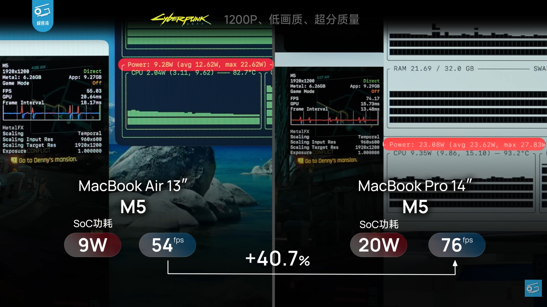 Koreli teknoloji yorumcusu Geekerwan'ın raporlarıcyberpunk 2077 'de MetalFx yukarı örnekleme ile 1200p/düşük hızda MacBook Air 13 M5 yalnızca 9 W tüketti ve 54 FPS elde etti. Ancak MacBook Pro 14 M5, 20 W tüketirken oyunu 76 FPS'de çalıştırdı. Bu, iki dizüstü bilgisayar arasında %40,7'lik dev bir performans farkı anlamına geliyor.