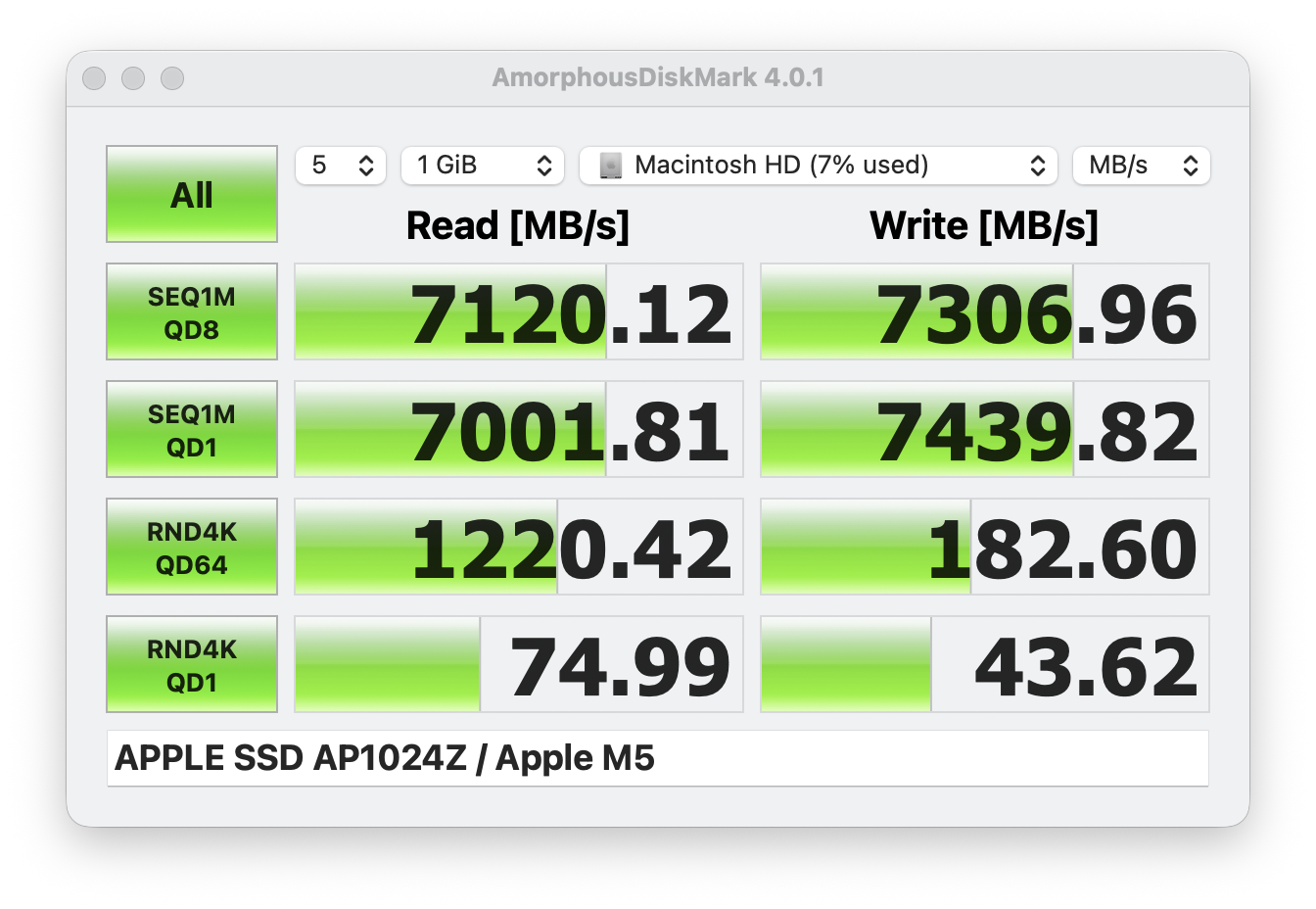 Apple şu anda piyasada bulunan en hızlı tek çekirdekli işlemci olan yeni M5 SoC ile performansı bir kez daha önemli ölçüde artırdı. Eski M4 SoC'ye kıyasla çok çekirdekli ve grafik performansındaki gelişmeler şimdi daha da büyük. Ayrıca SSD'lerin hızı PCIe 4.0 seviyelerine yükseltilmiştir.