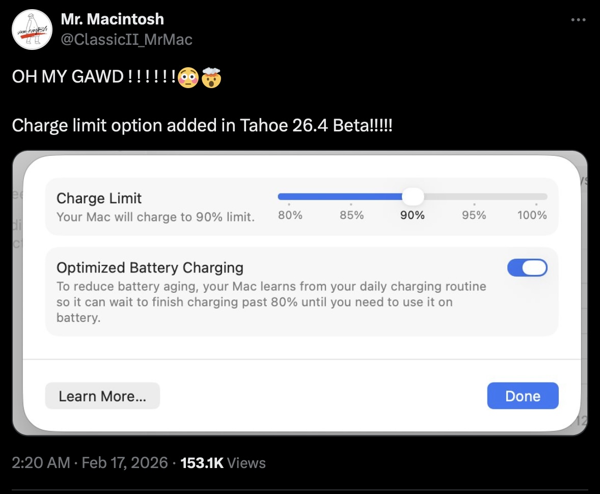En son macOS Tahoe 26.4 Beta ile, Apple AlDente gibi uygulamalar için mezar kazmış gibi görünüyor. MacBook kullanıcıları ilk kez Sistem Ayarları uygulamasından şarj limitlerini belirleyebiliyor, ancak mümkün olan en düşük değer %80'de kilitli. Her ne sebeple olursa olsun daha da düşük rakamlar isteyenler yine de üçüncü parti çözümleri tercih etmek zorunda kalacaklar.