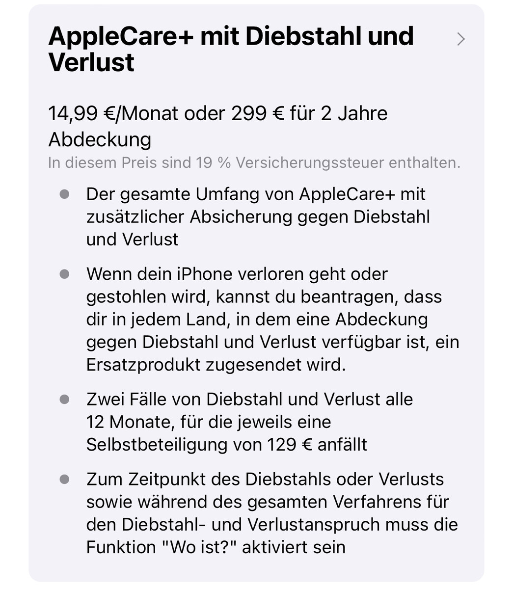 Garanti yalnızca 12 ay sürüyor ve Apple sigorta planını, Care+, bir defaya mahsus 199 ABD doları karşılığında iki yıl boyunca sunmaya devam ediyor. Bu plan, kaza sonucu hasar durumunda sınırsız onarım, hızlı değişim hizmetleri ve öncelikli desteği içeriyor. Hasarın türüne bağlı olarak, ek ücretlere tabi olabilirsiniz. 269 ABD Doları karşılığında, hırsızlık veya kayıp durumunda da sigortalanabilirsiniz - ancak yılda en fazla iki kez. İsterseniz bu hizmet için en az iki yıl boyunca aylık ödeme de yapabilirsiniz (9,99 ABD$ veya 13,49 ABD$), ancak daha uzun süre sigortalı olmak isterseniz bu süre uzatılabilir.