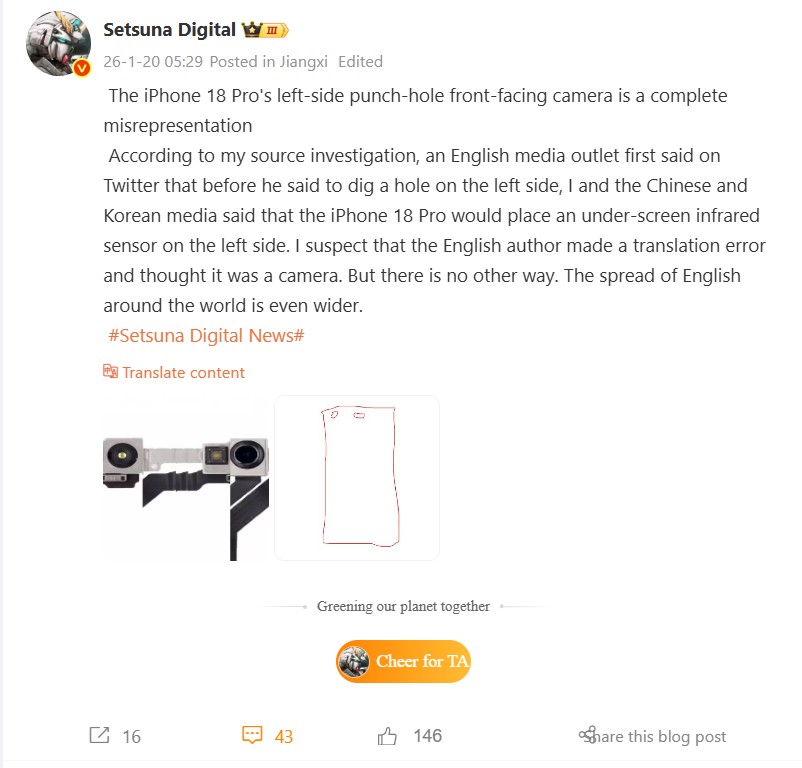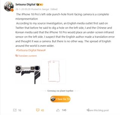 Çok sık olmamakla birlikte, bu durumda iPhone 18 Pro ile ilgili delikli sızıntılar görünüşe göre az ya da çok basit bir çeviri hatasına dayanıyordu. Bunun sonucunda iPhone 18 Pro ve iPhone 18 Pro Max'in ön yüzünün nasıl görünebileceğini gösteren çok sayıda render görüntüsü ve hatta önde gelen bir sızıntıcıdan bir video ortaya çıktı. Bu resimlerde ekranın ortasında geniş bir Dinamik Ada yerine sol üst tarafta bir delik hayal edilmişti.
