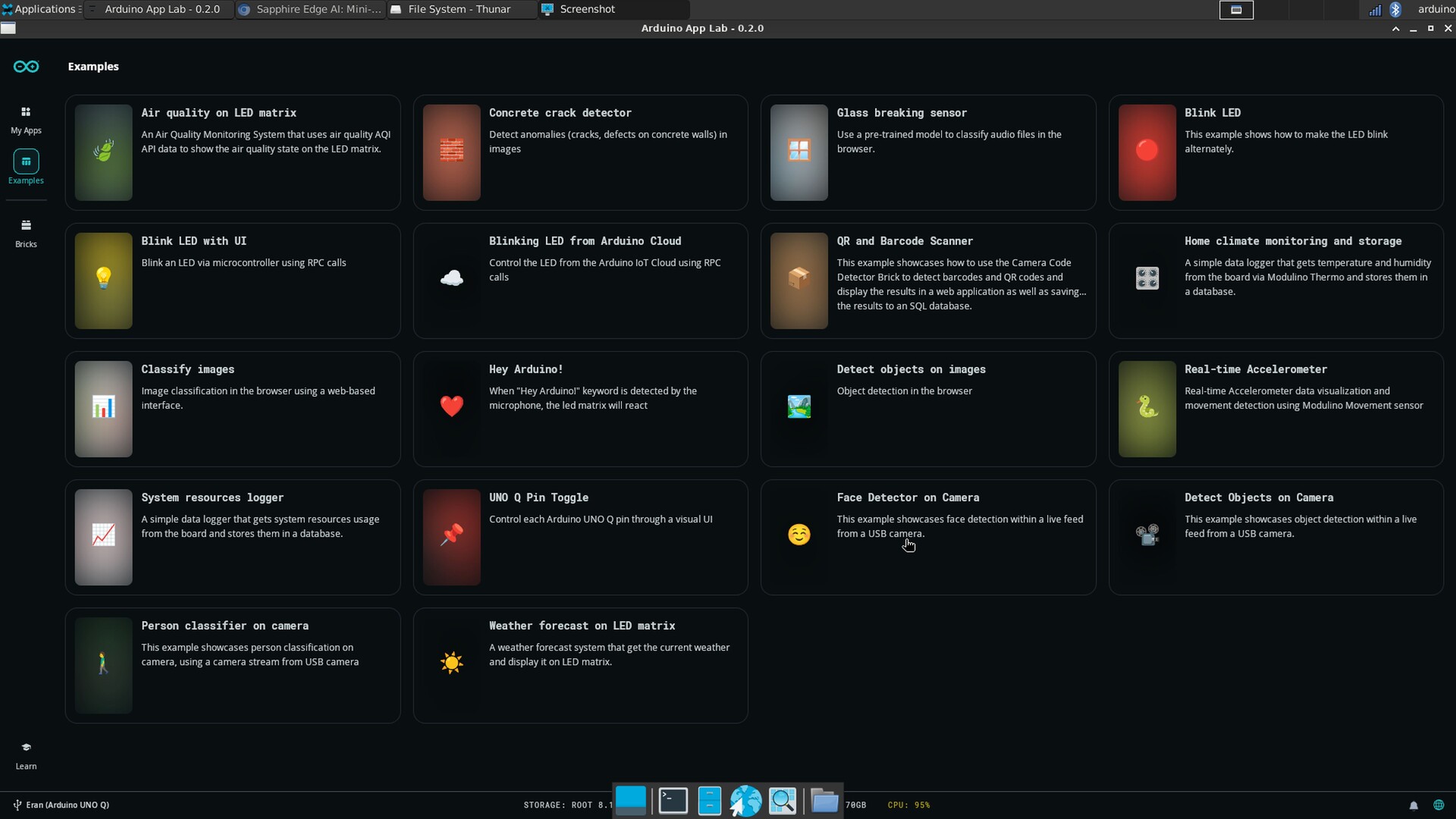 Arduino App Lab önceden yüklenmiş olarak geliyor ve ilk kurulumdan sonra Wi-Fi üzerinden güncelleniyor. Hem Qualcomm SoC hem de yerleşik MCU'dan yararlanan uygulamalar oluşturmanıza olanak tanır. Dahil edilen örnekler bunu iyi bir şekilde göstermektedir: kart, bir geliştirici platformu için nispeten yüksek bilgi işlem gücü sunarak yerel yapay zeka iş yüklerini mümkün kılar. Görüntü tanıma gibi görevler için önceden eğitilmiş modeller destekleniyor ve geleneksel bir geliştirici kartının yetenekleri sinir ağı tabanlı uygulamaları içerecek şekilde genişletiliyor.