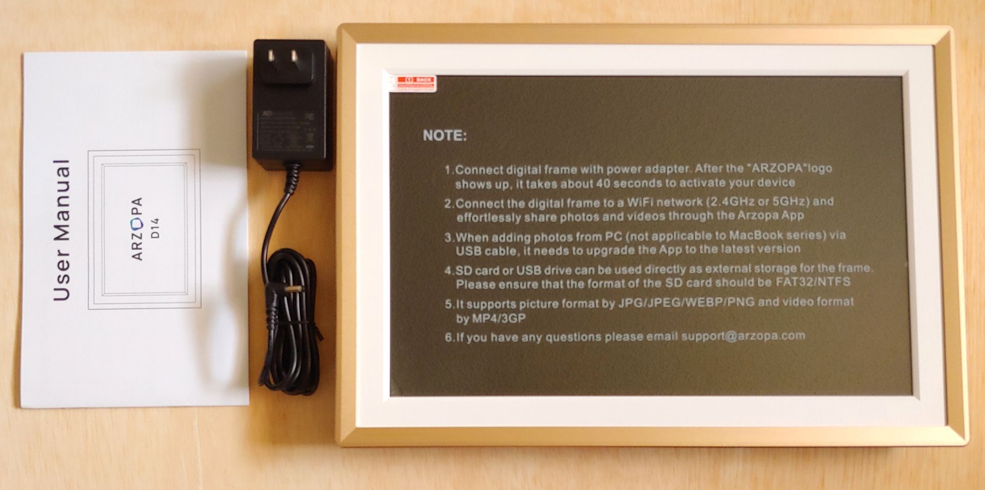 Arzopa, bir AC adaptörü ve bir kullanım kılavuzu ile birlikte paketlenmiştir.