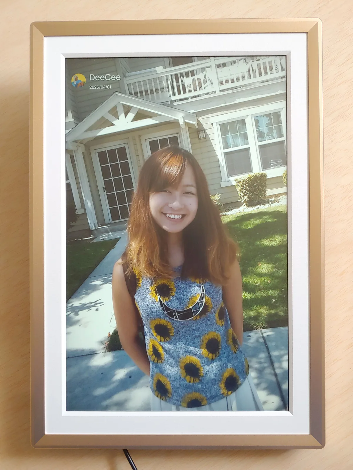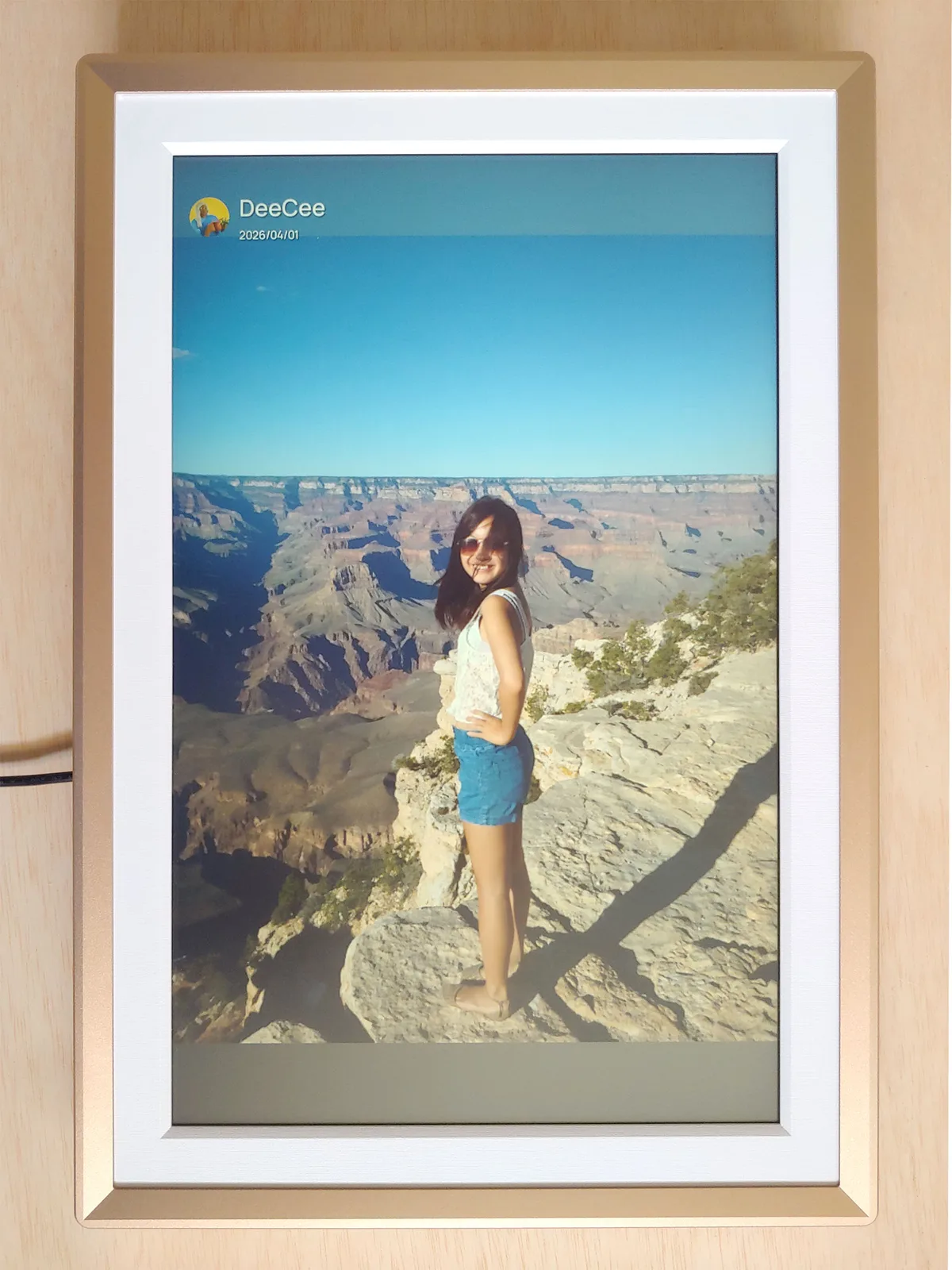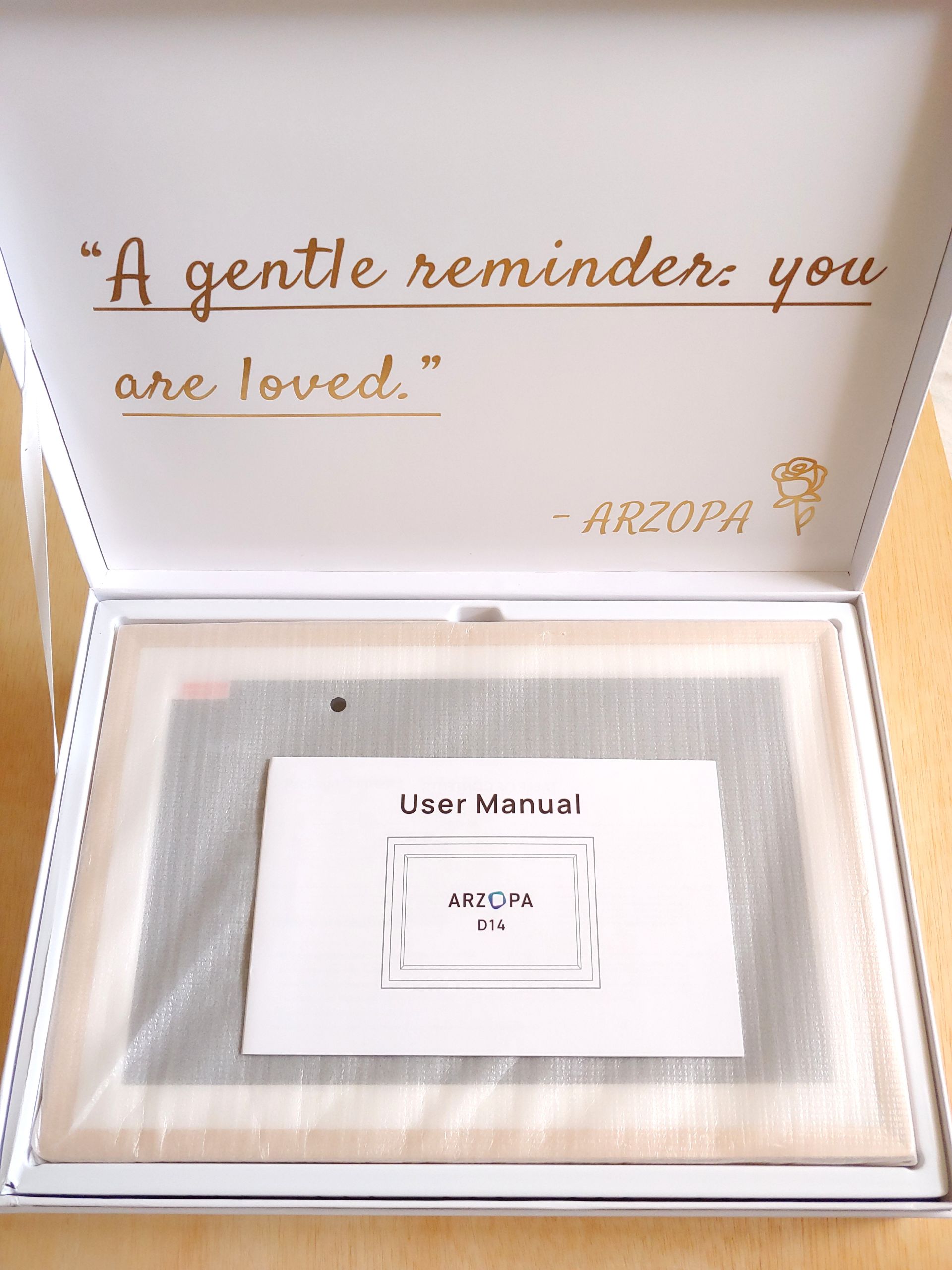 Arzopa D14 dijital fotoğraf çerçevesi, bulutta depolanan sonsuz bir resim akışını görüntüler ve yeni görüntüler arkadaşlar ve aile tarafından uzaktan eklenebilir.