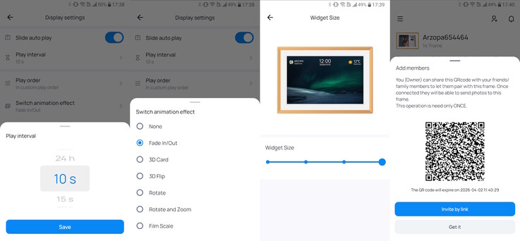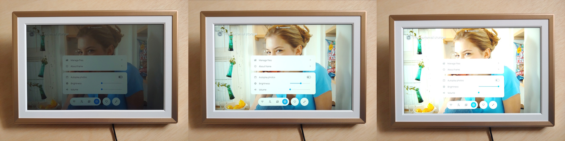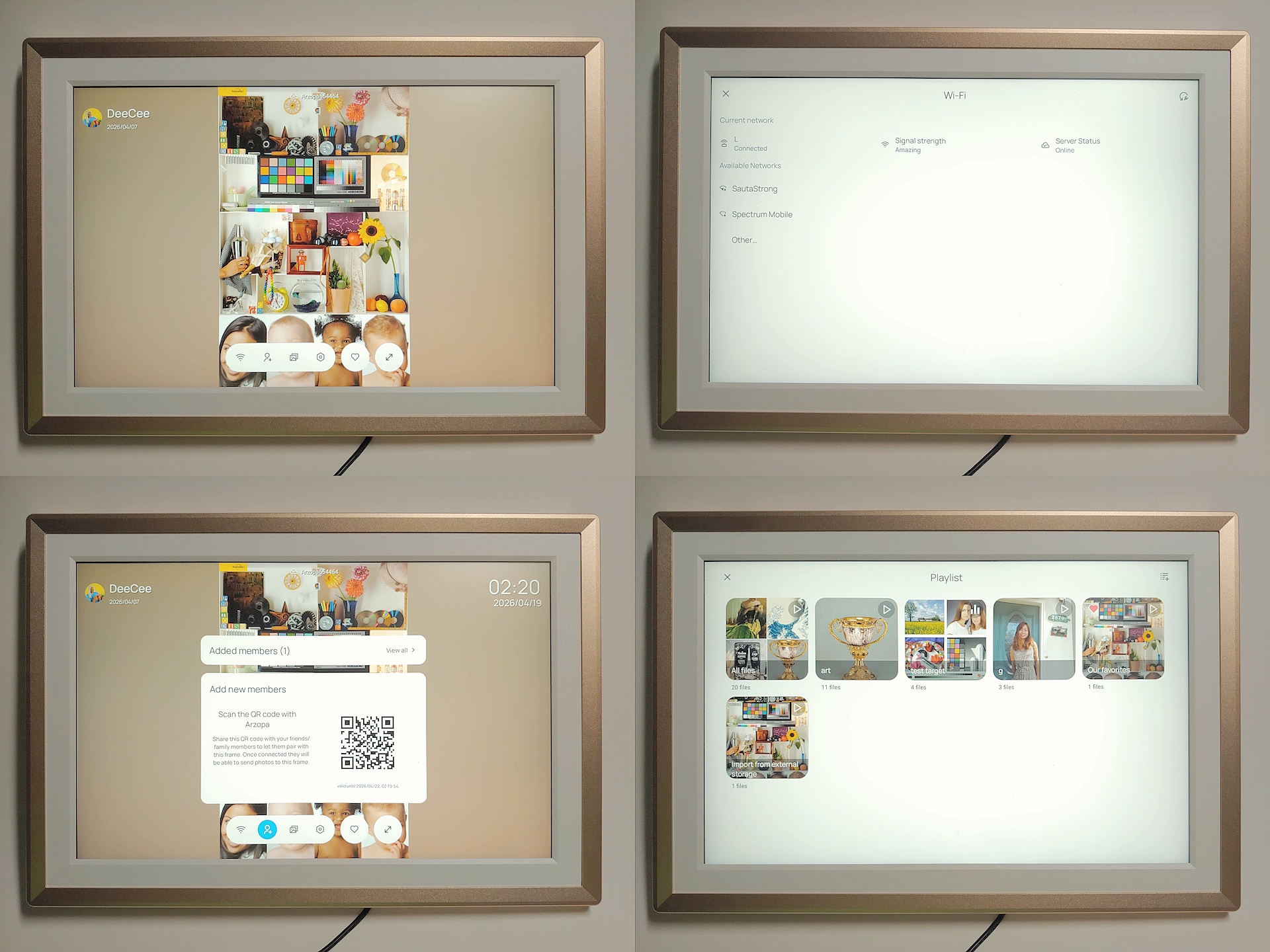 Wi-Fi ayarları yeni bir bağlantı eklemeyi kolaylaştırıyor, ancak proxy ağlar desteklenmiyor. Kullanıcı ayarları, uzaktan fotoğraf yükleyebilen yeni üyelerin hızlı bir şekilde eklenmesini sağlar. Fotoğraflar menüsü, kullanıcıların SD karttan medya oynatmasına, USB üzerinden dosya aktarmasına, öğeleri silmesine veya çerçeveyi sıfırlamasına olanak tanır ve büyük kitaplıkları düzenlemek için klasörler mevcuttur. Sistem ayarları parlaklığı, ses seviyesini, fotoğraf otomatik oynatmayı ve dosya yönetimini kontrol eder.